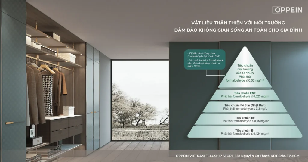 Tủ quần áo Oppein được cấu thành bởi vật liệu lõi đạt tiêu chuẩn ENF và lớp phủ với mức phát thải formaldehyde thấp, dưới 0,025 mg/m3. Lớp phủ này mang lại hiệu suất lọc formaldehyde lên đến 95,1% và duy trì hiệu quả dài lâu ở mức 82,4%. Đây là công nghệ độc quyền đã được cấp bằng sáng chế.