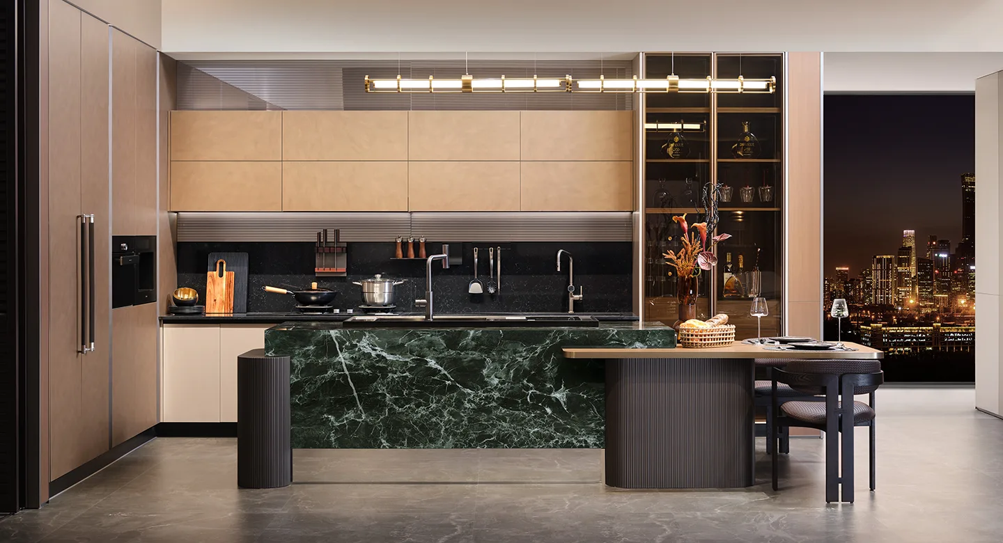 Lấy cảm hứng từ những gam màu tự nhiên, bộ tủ bếp được phối hợp hài hòa giữa màu đất trung tính và đảo bếp màu xanh ngọc lục bảo ấn tượng. Tông nâu ấm của gỗ và sắc xanh sâu của mặt đá tạo nên sự cân bằng tinh tế, vừa hiện đại, vừa gần gũi, khiến không gian trở nên thư thái và đầy cảm hứng.