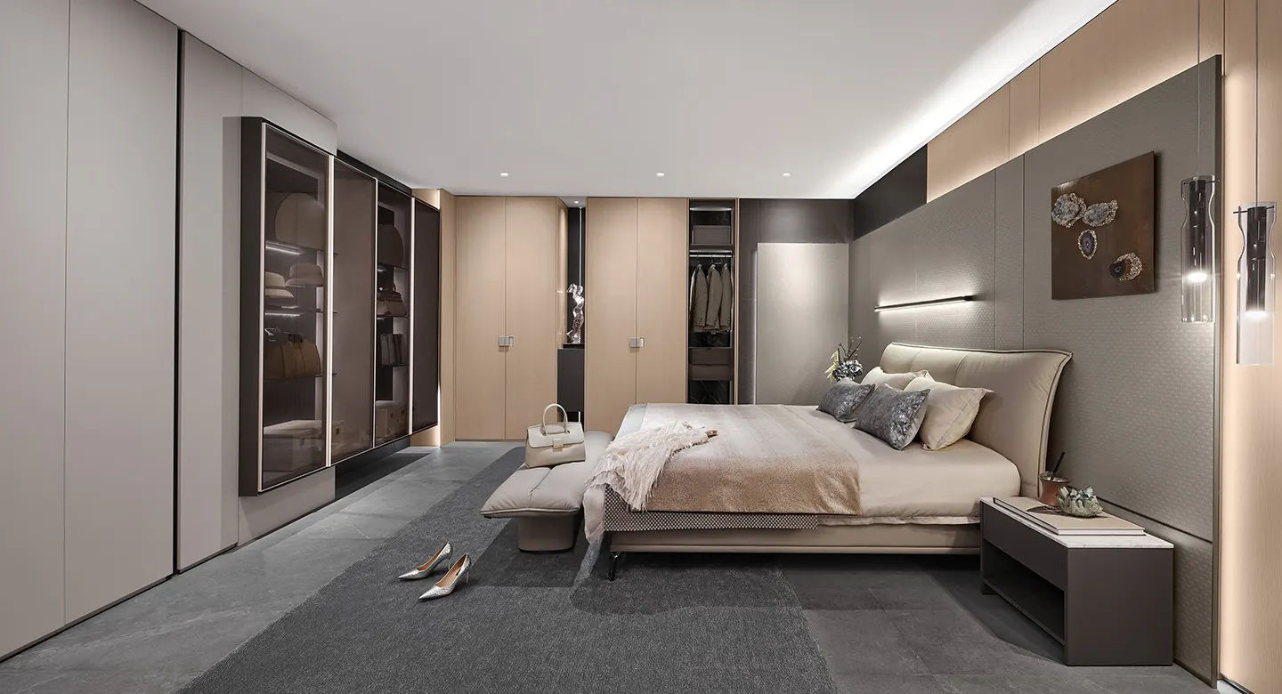 Phòng ngủ tiếp tục đi theo bảng màu gỗ sồi sáng, tạo cảm giác thư giãn ngay khi bước vào. Hệ tủ âm tường cửa phẳng giúp tối ưu diện tích, đồng thời giữ sự gọn gàng cho toàn bộ không gian. Đường nét mềm của giường ngủ kết hợp ánh sáng hắt dọc đầu giường tạo cảm giác ấm và dễ chịu. Những mảnh trang trí nhỏ được lựa chọn tiết chế, tập trung vào sự tinh tế thay vì phô trương.