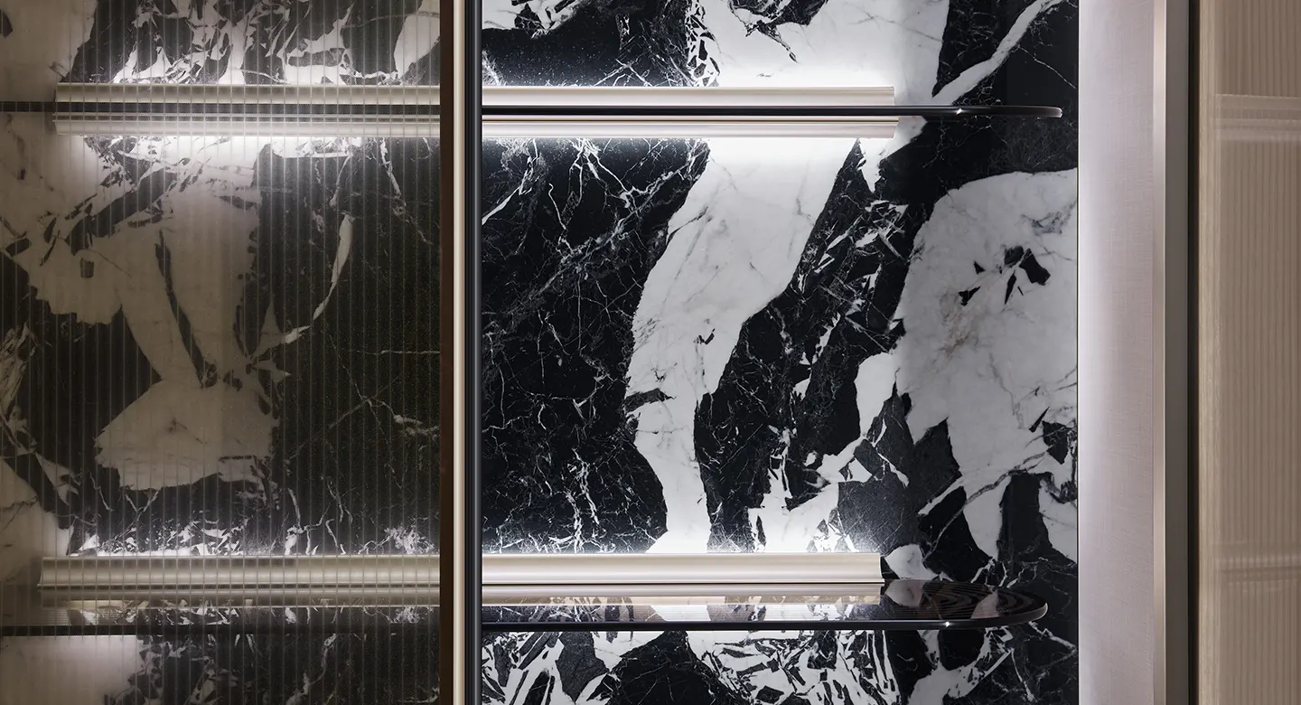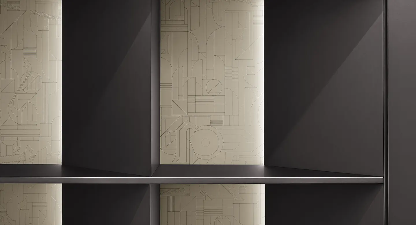 - Một số khoang kệ mở hoặc ô kính được bố trí có kiểm soát để tạo nhịp và trưng bày nhẹ nhàng.