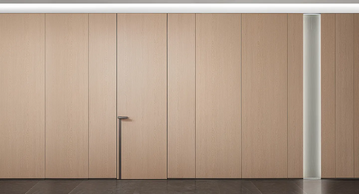 Hệ cửa và tấm ốp gỗ sồi giữ vai trò quan trọng trong việc định hình sự liền mạch giữa các không gian. Cửa được hoàn thiện phẳng với tay nắm kim loại màu xám, tạo cảm giác trang nhã và hiện đại. Các tấm ốp tường đồng màu với cửa giúp che giấu khe nối, tạo thành một mặt phẳng liên tục, mang lại hiệu ứng tối giản cao cấp, một trong những đặc trưng nổi bật của phong cách hiện đại.