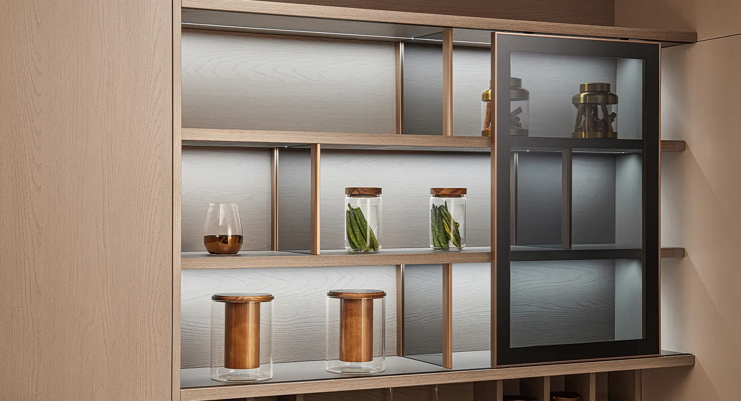 - Một số chi tiết dùng veneer/gỗ vân rất nhạt hoặc kính trong/kính khói cho tủ trưng bày.