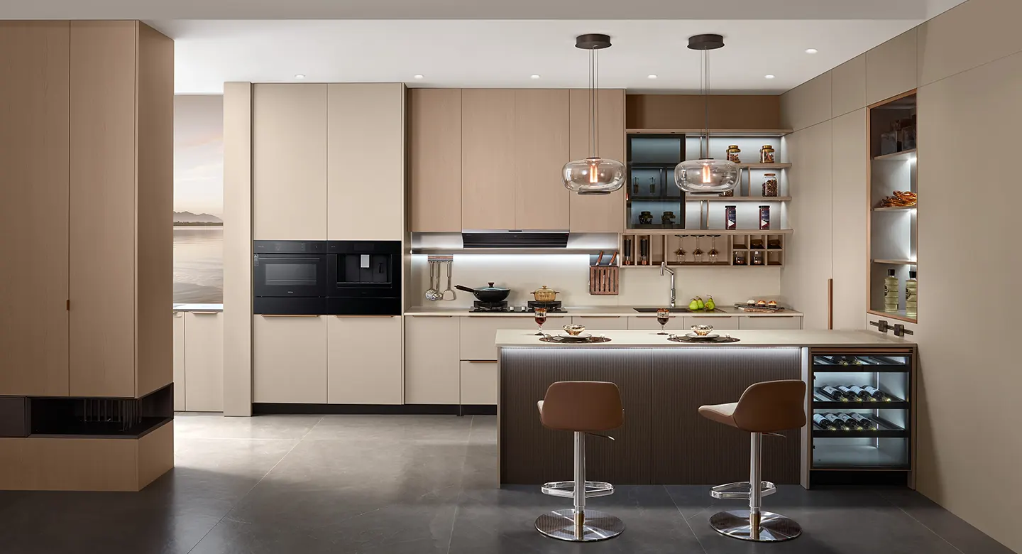 Phòng bếp được thiết kế theo bố cục gọn, với hệ tủ cao kịch trần phủ gỗ sồi tạo sự liền mạch. Mặt bàn bếp sáng màu và hệ đèn treo tạo điểm nhấn thị giác, đồng thời tối ưu ánh sáng cho thao tác nấu nướng. Kệ mở, khoang rượu và khu vực để ly được bố trí hợp lý để mang lại sự tiện nghi, sạch sẽ và sang trọng. Các thiết bị bếp âm giúp giảm bớt chi tiết thừa, giữ lại vẻ tinh gọn đúng tinh thần hiện đại.