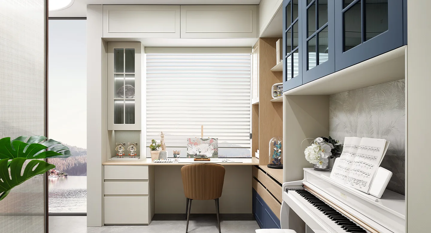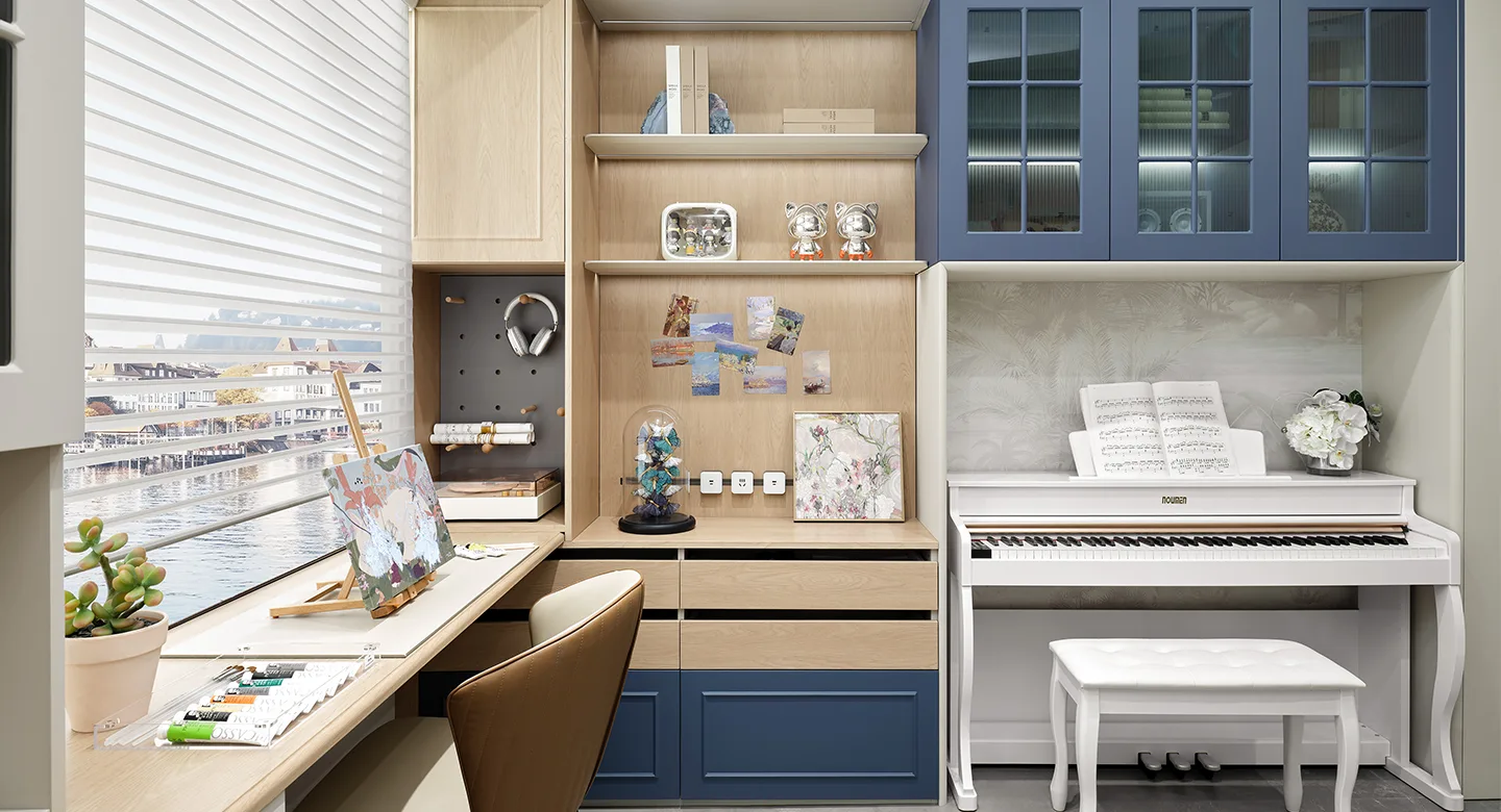 Light maple and Manhattan Blue color combination creates a balanced environment