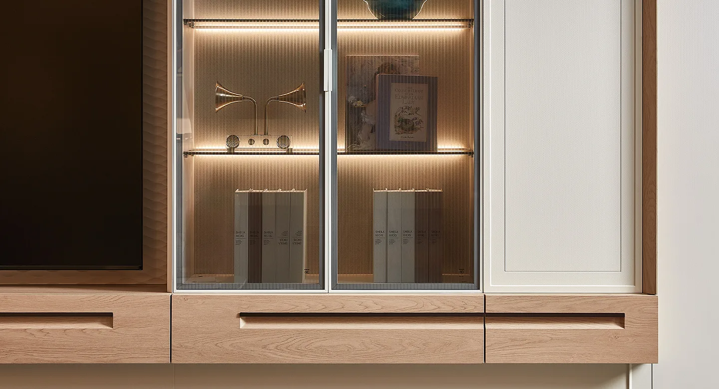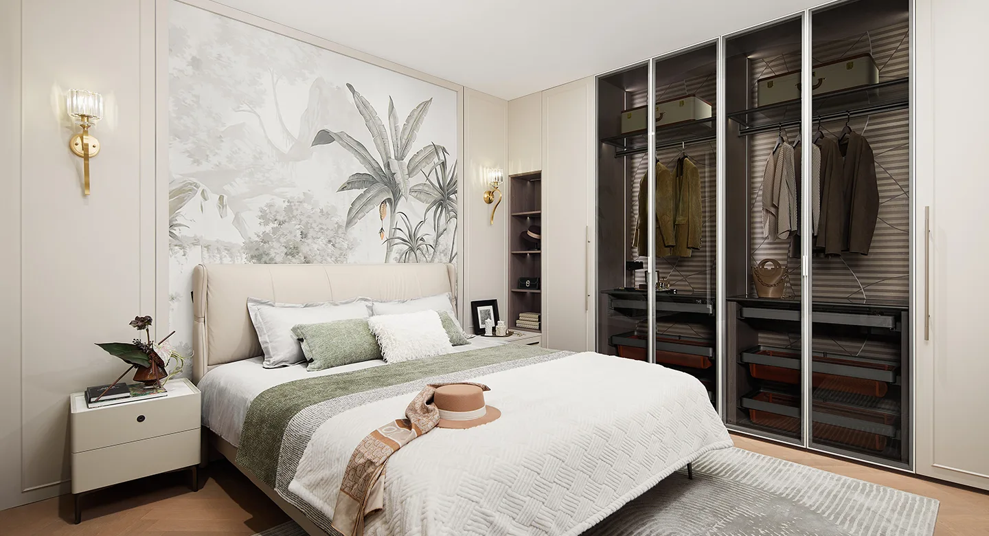 Wardrobe system with aquatex glass panels for refined visibility