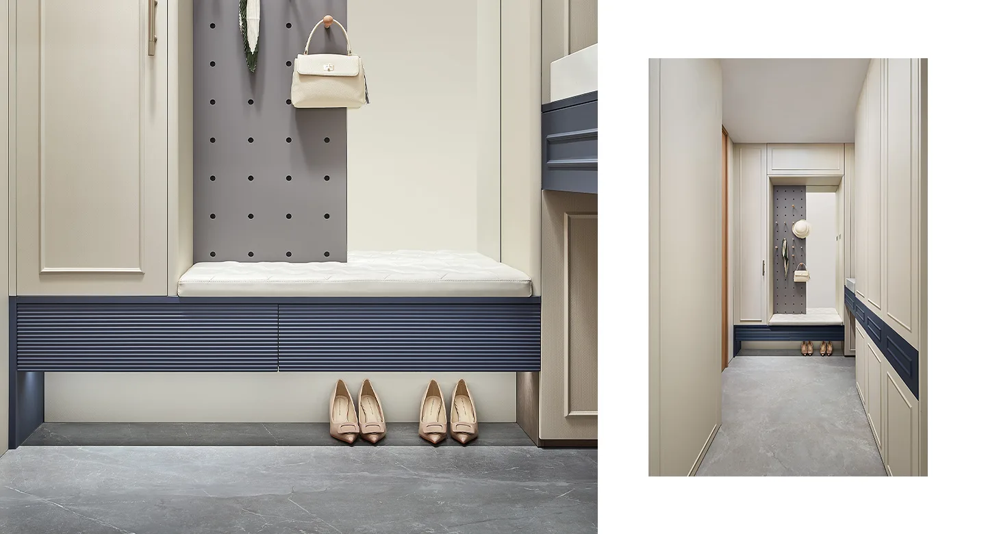 L-shaped cabinet configuration with floating drawers for shoe storage