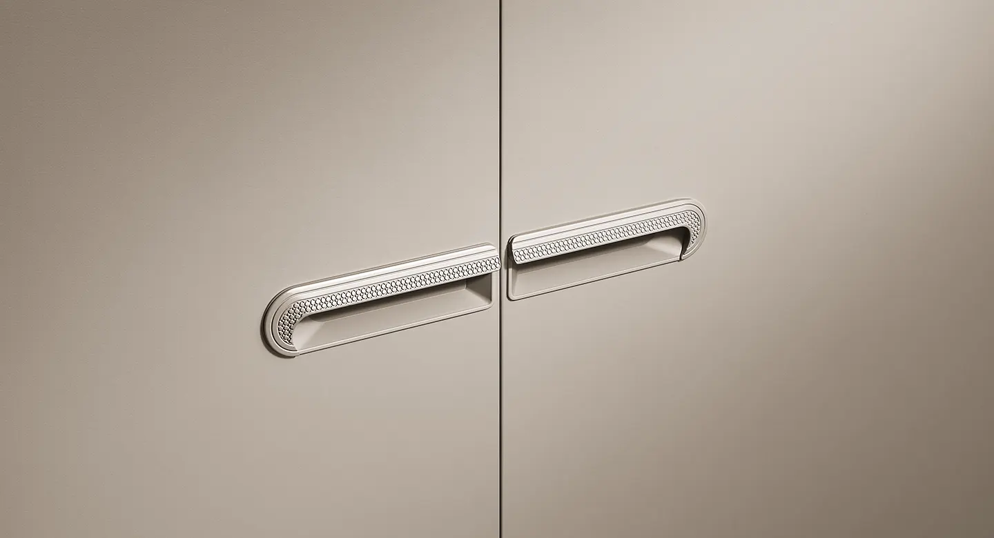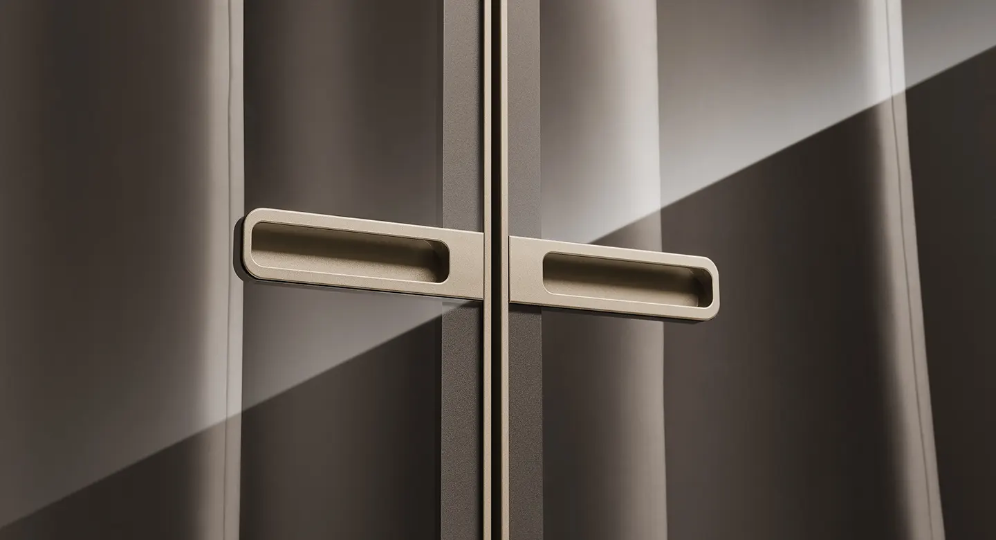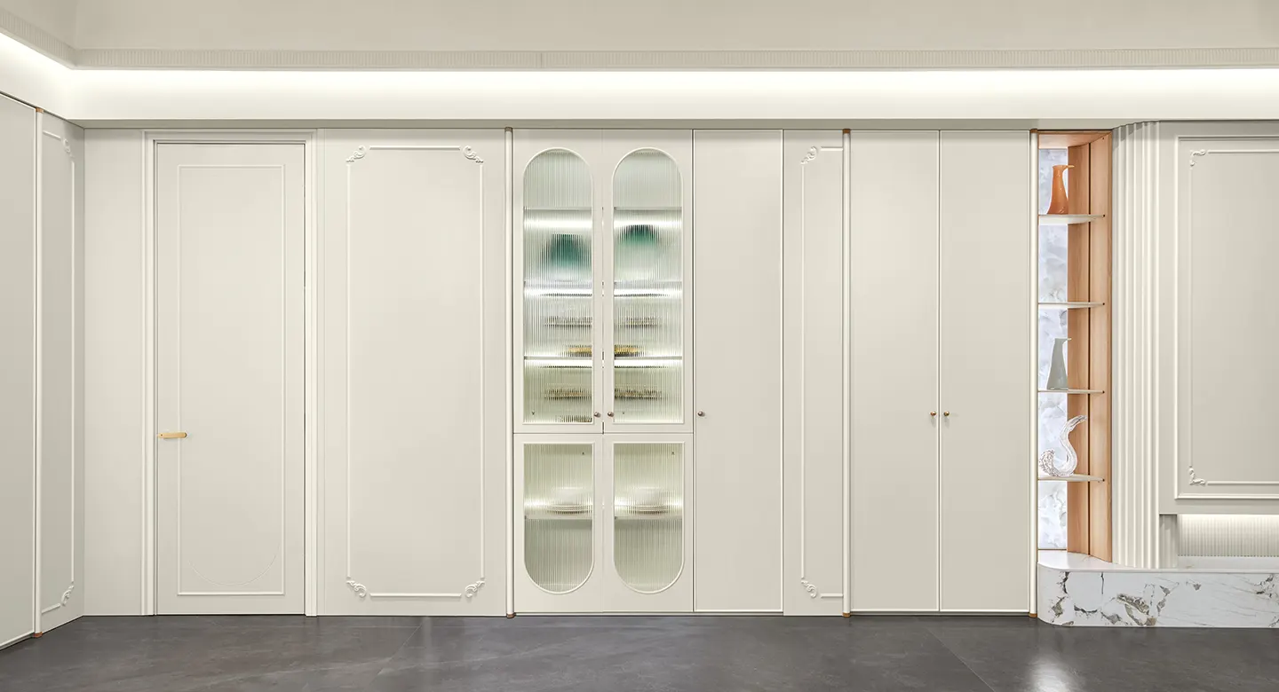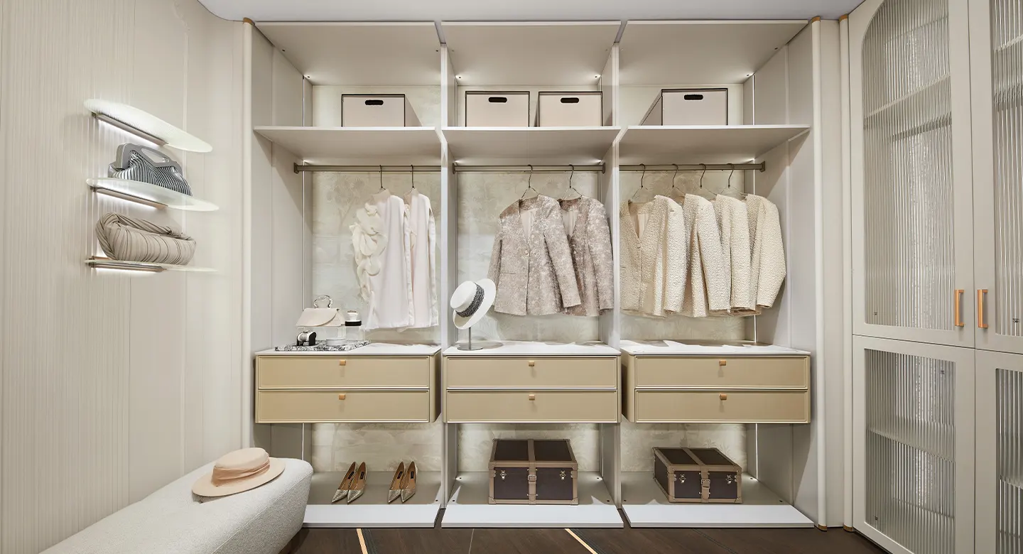 Thiết kế tủ quần áo gây ấn tượng với những đường nét thanh thoát và chất liệu cao cấp. Tông màu trắng ấm thuần khiết mang đến không gian thư thái, yên bình, hài hòa giữa vẻ đẹp tinh tế và sự dễ chịu. Các cánh tủ kính khung nhôm được thiết kế mở dạng cửa xoay, phối hợp tay nắm kim loại âm tinh tế, tạo nên vẻ đẹp tối giản, sang trọng và mang lại cảm giác thoáng đãng cho không gian.