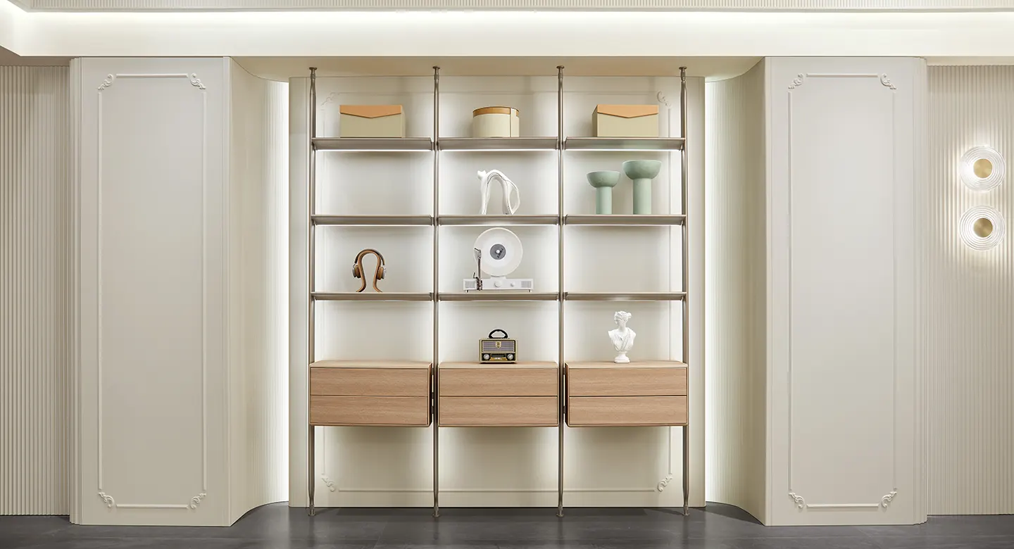 Phòng khách được thiết kế với hệ tủ trưng bày âm tường, là điểm nhấn lý tưởng cho những bộ sưu tập yêu thích. Kết hợp kệ kim loại thanh thoát, tủ ngăn kéo veneer gỗ sồi và ánh sáng ấm dịu, tổng thể tạo nên một không gian vừa hiện đại vừa gần gũi.