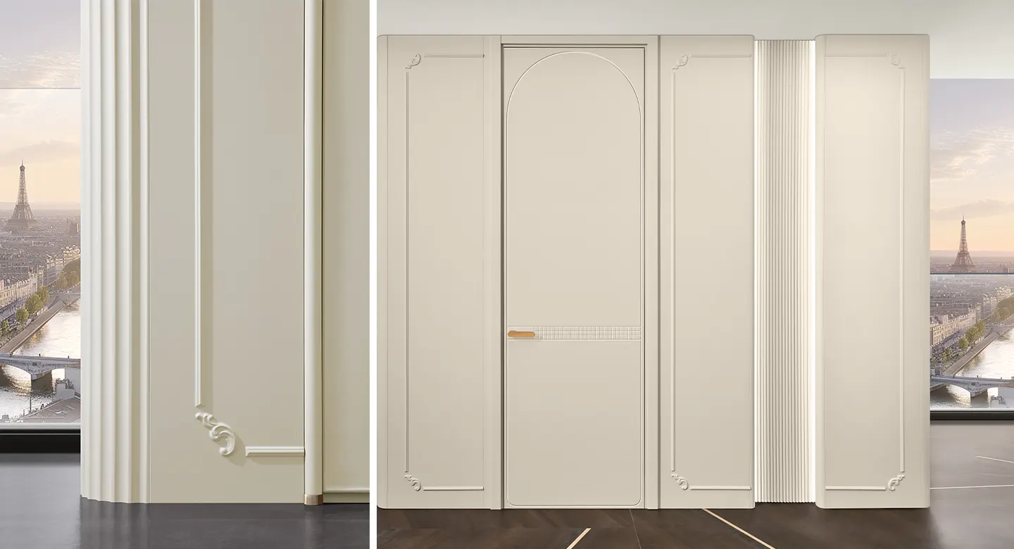 Cửa nội thất và tấm ốp tường được làm từ cùng loại gỗ và hoàn thiện đồng nhất, tạo nên sự thống nhất và hài hòa trong tổng thể không gian mang phong cách hiện đại kiểu Pháp.