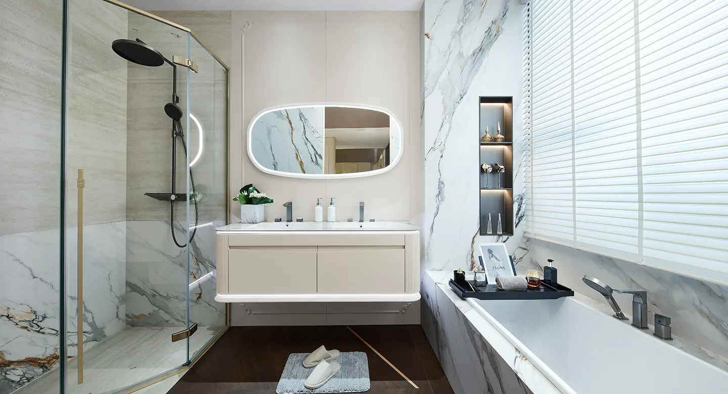 Phòng tắm Rococo: Tủ phòng tắm sử dụng gam màu sáng nhẹ nhàng cùng những đường cong uyển chuyển, tạo nên không gian tinh tế, lãng mạn và ấm cúng.