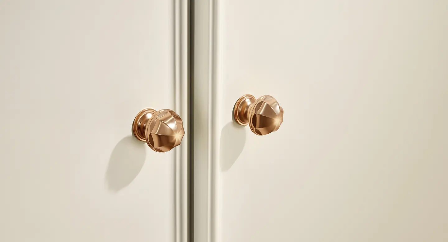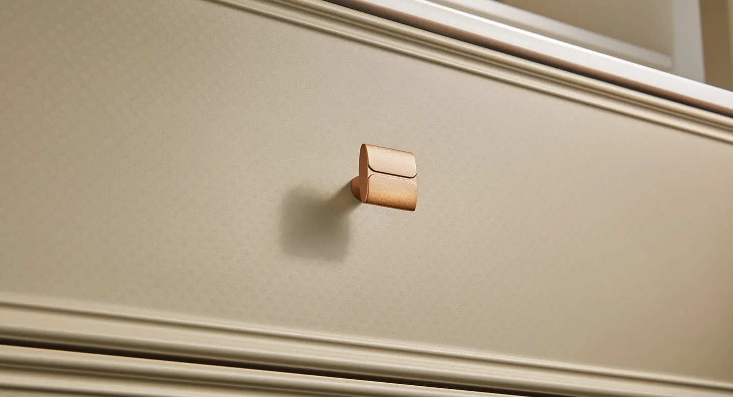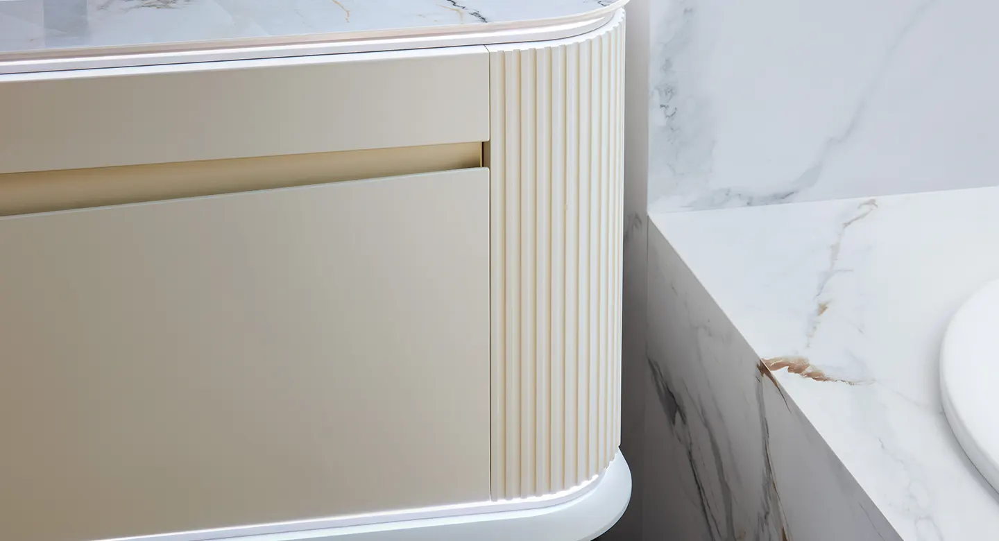Phòng tắm Baroque: Tủ phòng tắm phủ sơn trắng mịn mang sắc thái lãng mạn, điểm xuyết những đường nét trang trí vàng champagne tinh tế, tạo nên không gian sang trọng và duyên dáng. Các góc tủ bo tròn với họa tiết rãnh sóng nhẹ nhàng góp phần làm mềm mại tổng thể, hòa quyện tinh tế trong phong cách nội thất hiện đại kiểu Pháp.