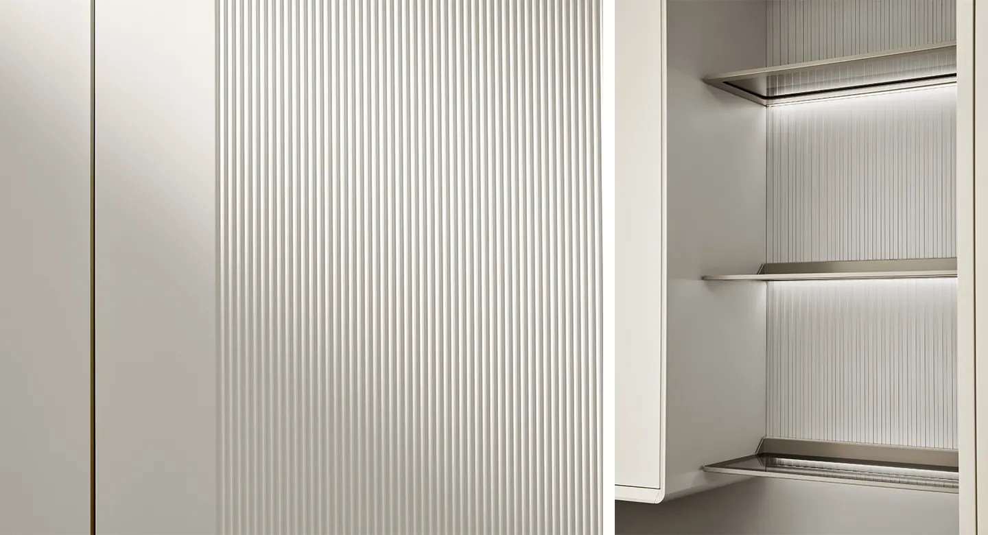 - Cánh tủ phẳng, chạy đường thẳng dứt khoát, nhiều mảng tủ cao kịch trần.