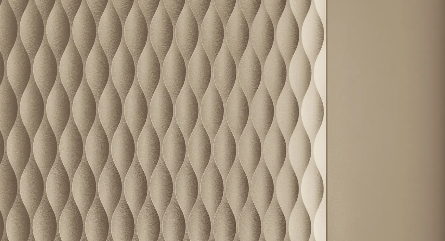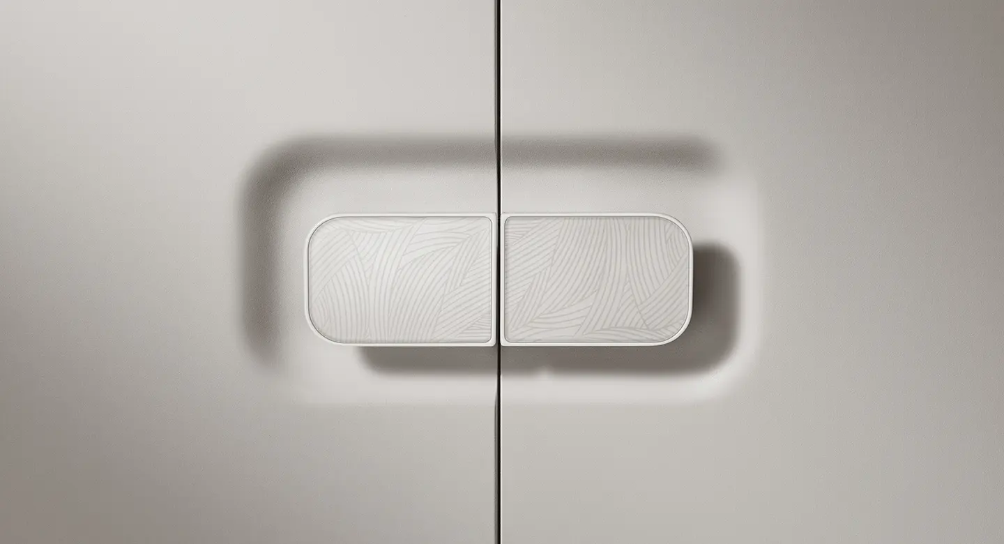 Hệ cửa và tấm ốp chính là sợi dây kết nối mọi không gian. Cánh cửa phẳng màu trắng dịu đi cùng chỉ dọc mảnh tạo cảm giác cao hơn, phối với tường ốp lam ngọc trầm và chân tường đá tạo điểm nhấn vững chãi. Tay nắm kim loại nhỏ gọn giữ vẻ tinh giản, không phá vỡ toàn bộ mặt phẳng.
