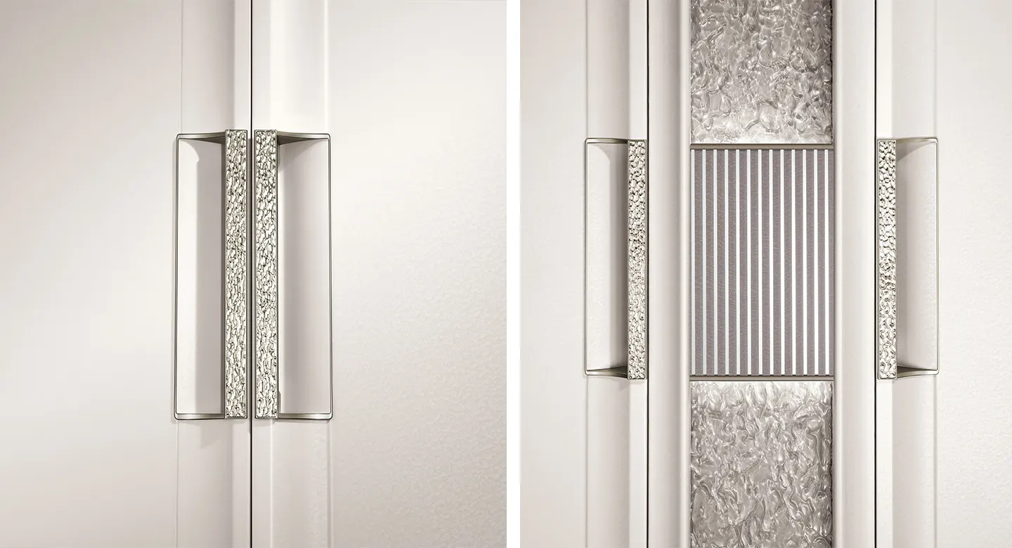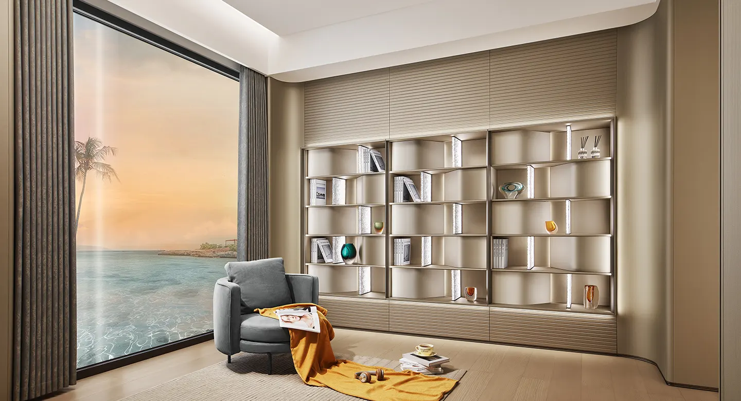 - Một số khoang dùng cánh kính khung mảnh và các panel soi rãnh dọc để tăng chiều sâu.
