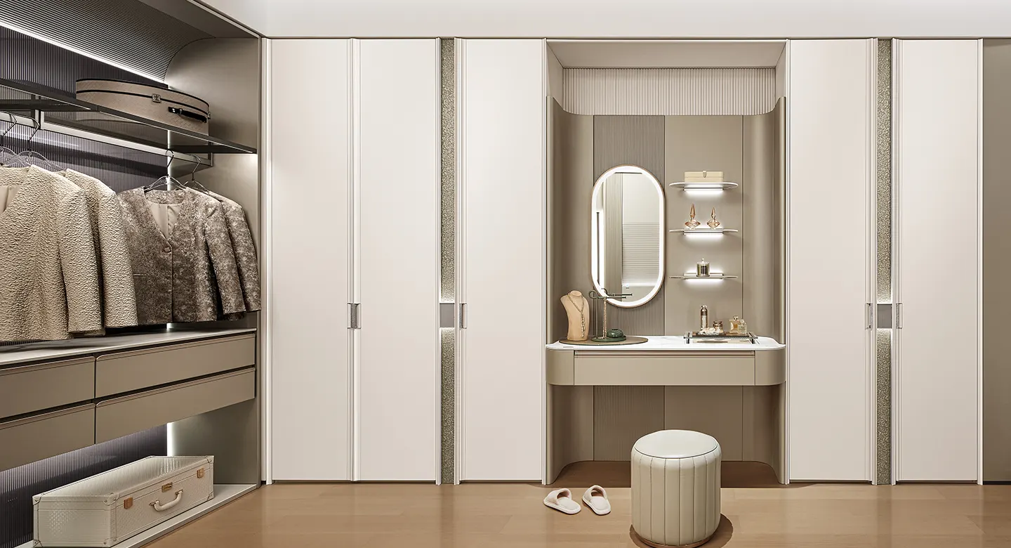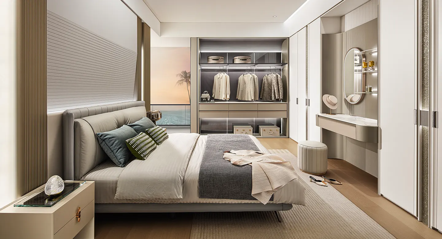 Đối diện giường là hệ tủ áo kịch trần, kết hợp giữa cánh kín và các khoang kính mở, thuận lợi phân chia khu vực quần áo thường ngày và khu trưng bày đồ yêu thích. Góc bàn phấn tích hợp với tủ bên cạnh, bo cong nhẹ ở đầu bàn, bên dưới là ghế đôn bọc nệm tròn, vừa mềm mại vừa tiết kiệm diện tích. Ánh sáng gián tiếp phía sau gương và trong khoang tủ giúp phòng ngủ luôn dịu mắt, phù hợp cho những giờ nghỉ ngơi sau một ngày dài.