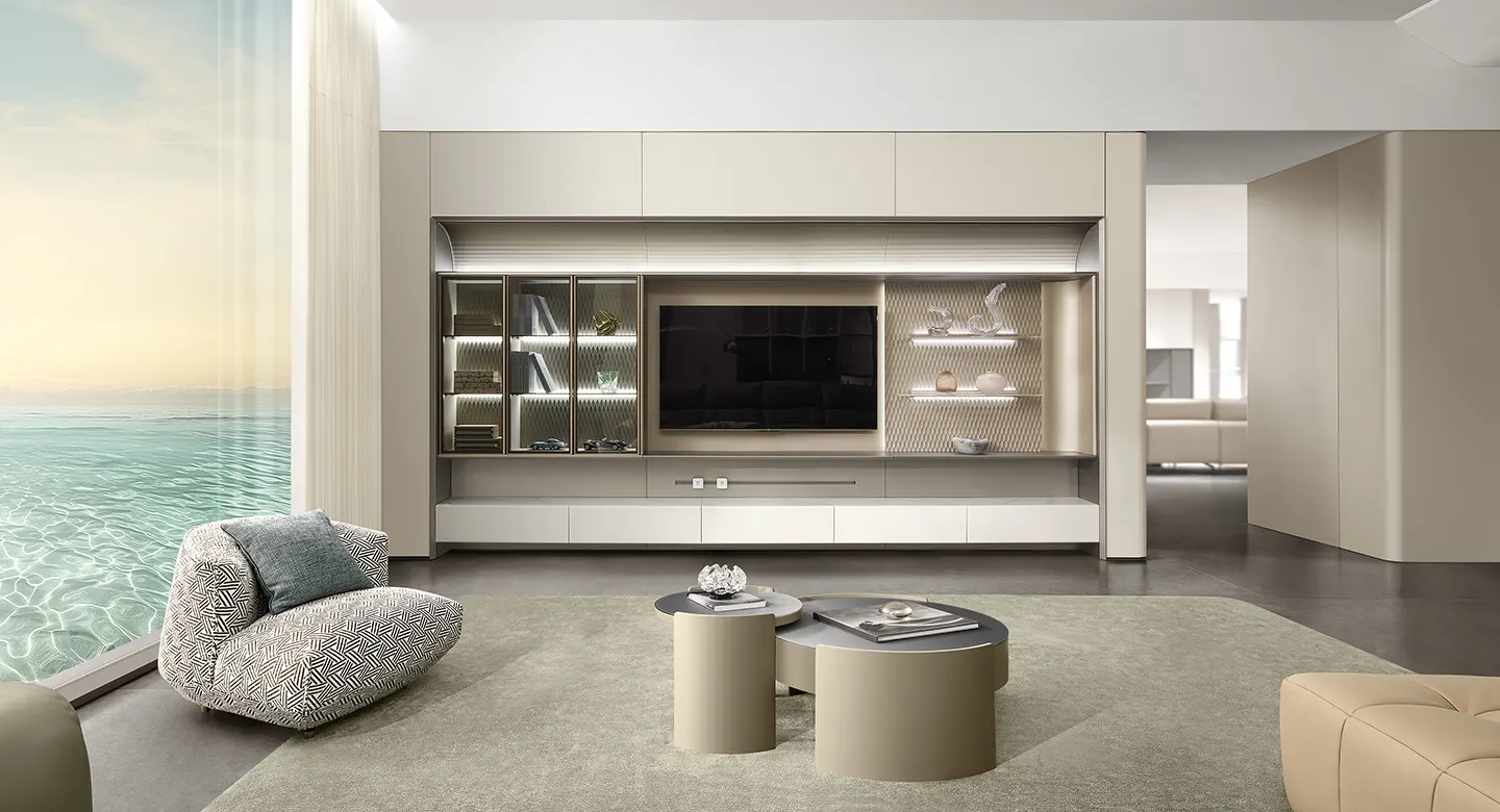 Phòng khách mở rộng về phía ban công với mảng kính lớn ôm trọn tầm nhìn ra biển. Bộ sofa bọc da màu be đặt trên thảm trung tính tạo điểm tựa êm ái, nhấn nhẹ bằng gối tựa xanh lam ngọc làm liên tưởng tới mặt nước ngoài khung cửa. Kệ tivi và hệ tủ treo hai bên sử dụng màu trắng dịu kết hợp nẹp xám, cửa tủ phẳng và tay nắm tối giản giúp mảng tường gọn gàng như một chiếc “khung” cho màn hình và đồ trưng bày.