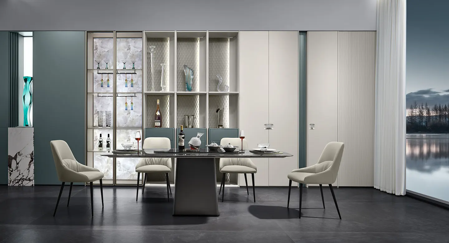 Một số mảng tường được thiết kế hốc trang trí ốp đá, đặt tượng hoặc bình nghệ thuật, có đèn hắt từ trên xuống để tạo chiều sâu. Tủ rượu ẩn sau cánh cửa cao kịch trần là chi tiết thú vị: khi đóng, bề mặt giống hệt các tấm ốp khác; khi mở ra, hệ kệ kính và đèn chiếu sáng phía sau hiện lên, biến mảng tường thành một quầy trưng bày sang trọng. Cách xử lý này giúp lưu trữ nhiều đồ mà căn hộ vẫn giữ được vẻ gọn gàng.