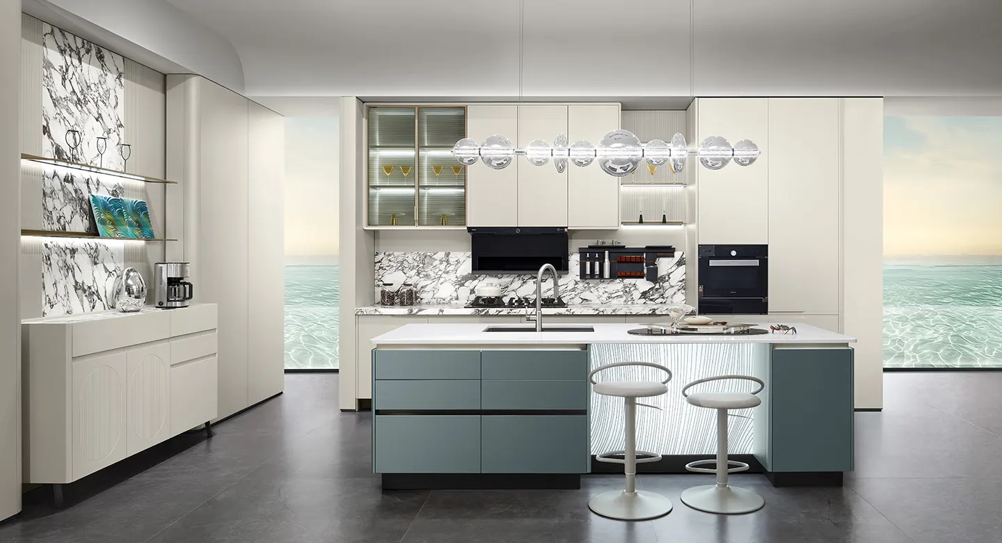 Giải pháp nội thất toàn diện sơn mài xanh teal kết hợp màu trắng dịu được Oppein phát triển dành riêng cho kiểu căn hộ ven biển. Từ hệ cửa, tủ bếp đến tủ quần áo, tấm ốp và đồ rời đều được thiết kế trong một concept thống nhất, giúp căn nhà giữ được trật tự thị giác, gọn gàng mà vẫn giàu cảm xúc.