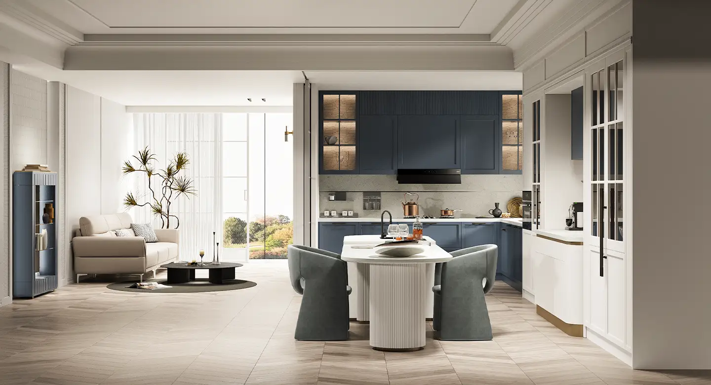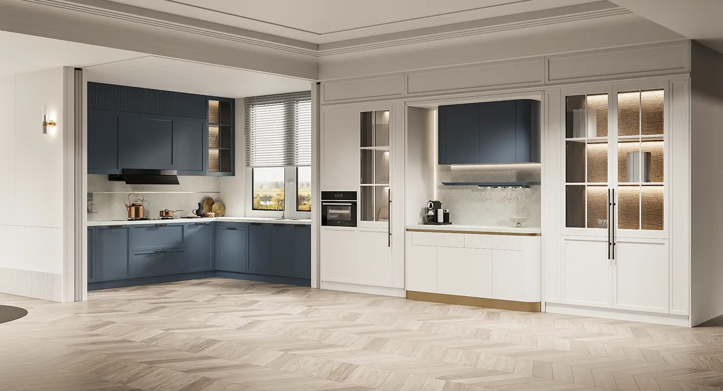 Cánh tủ dạng shaker với đường nét phẳng gọn gàng, kết hợp các rãnh dọc nhẹ nhàng ở đảo bếp và chi tiết trang trí, tạo hiệu ứng thị giác tinh tế, vừa cổ điển vừa đương đại.