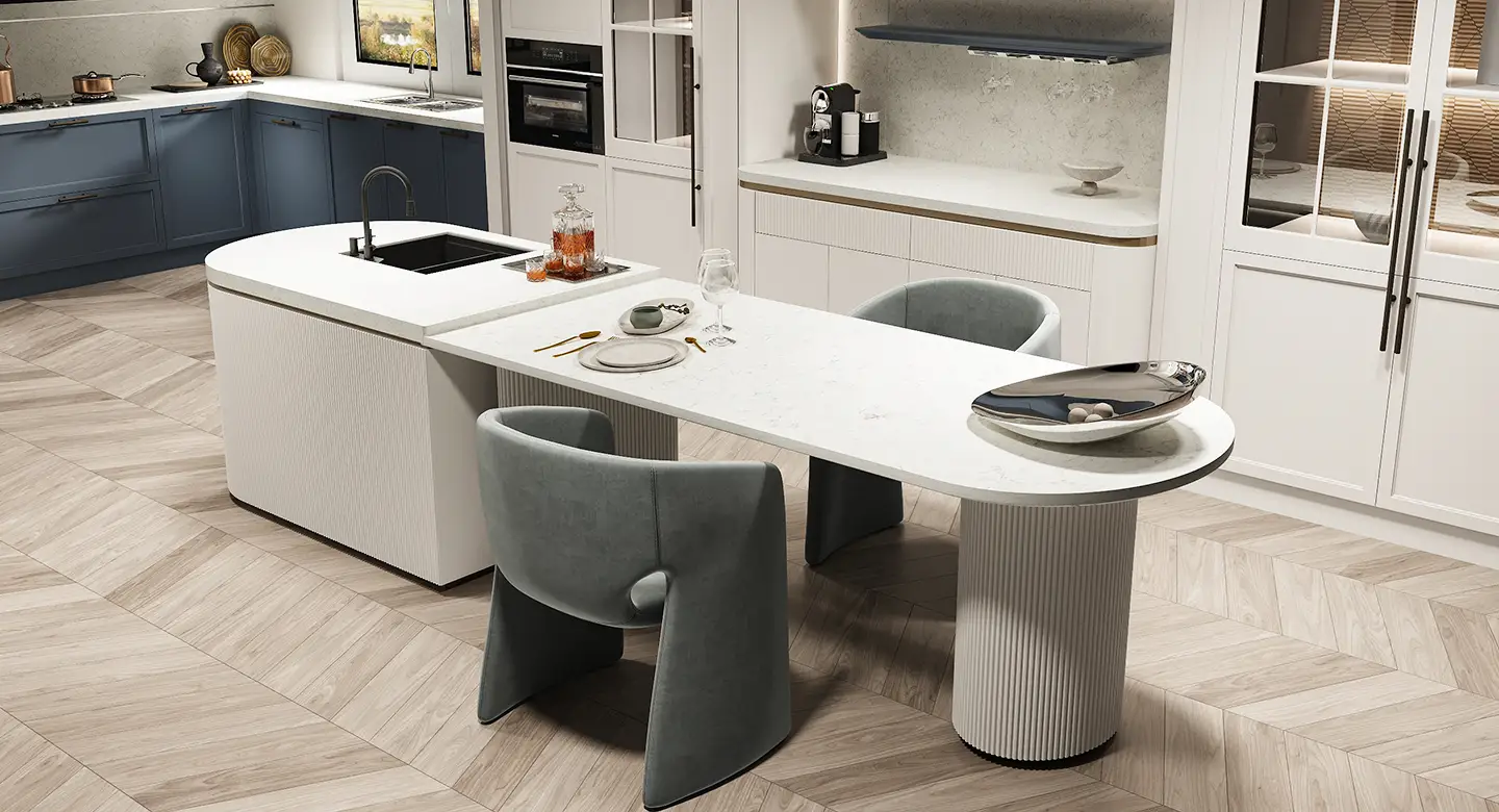 Đảo bếp thiết kế bo cong với các đường soi rãnh dọc tinh tế, kết hợp cùng bàn ăn mở rộng liền kề. Sự kết hợp này không chỉ tăng tính thẩm mỹ mà còn tối ưu công năng, tạo không gian kết nối giữa nấu nướng và sinh hoạt gia đình.
