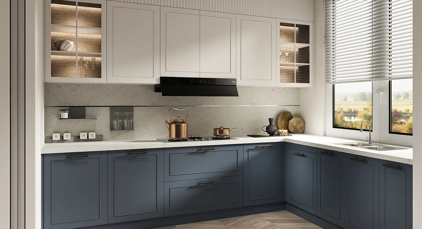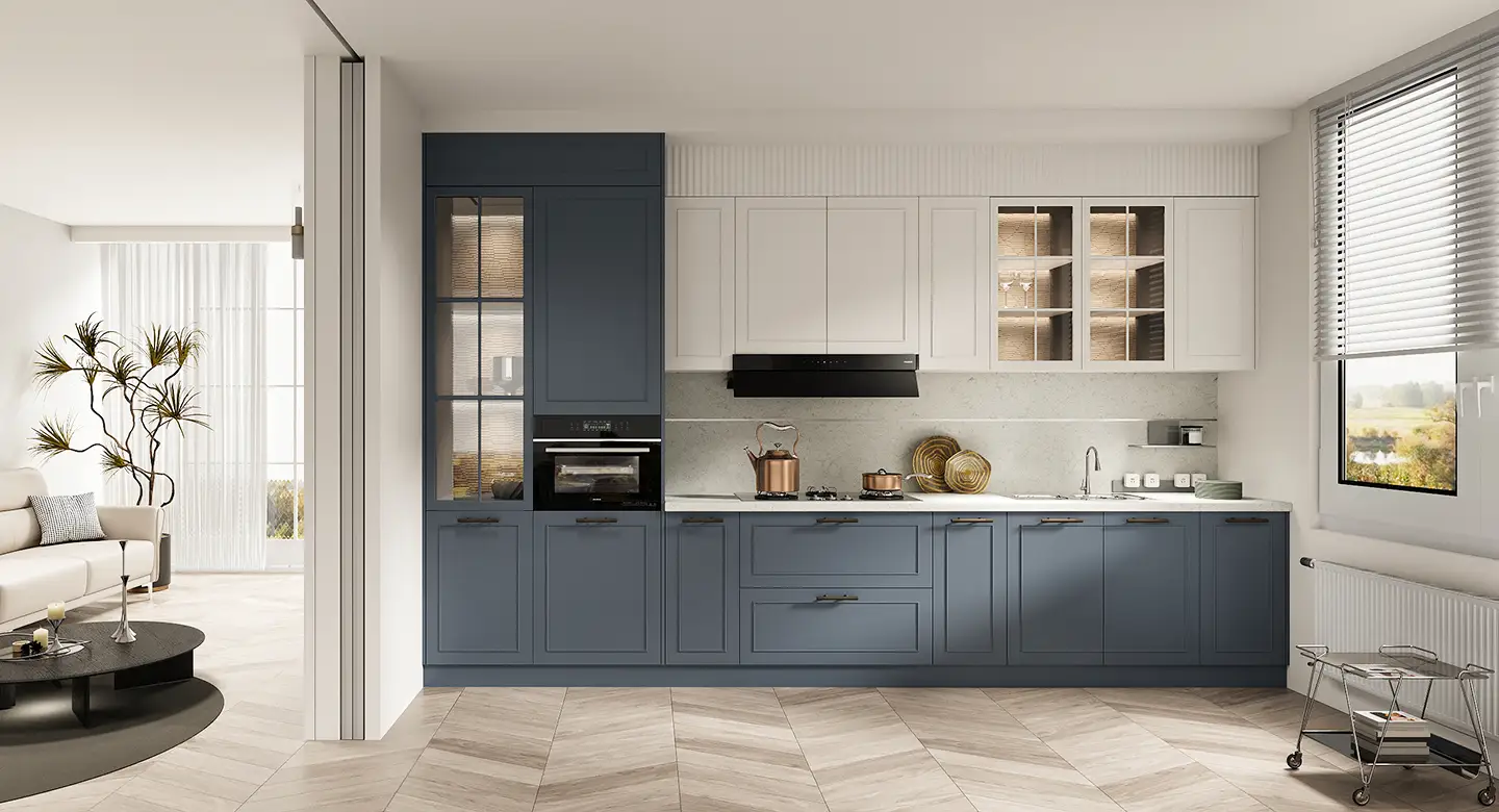 Mẫu tủ bếp được xây dựng dựa trên sự đối lập đầy tinh tế giữa gam trắng kem sáng thoáng và xanh Manhattan sang trọng. Đây không chỉ là sự kết hợp màu sắc thời thượng mà còn là giải pháp tối ưu để phân tách khu vực chức năng, mang lại cảm giác rộng rãi, hiện đại và hài hòa cho không gian bếp. Thiết kế này giữ lại đường nét cổ điển đặc trưng của phong cách shaker, đồng thời được làm mới bằng chi tiết soi rãnh và chất liệu cao cấp, phù hợp với nhịp sống đương đại.