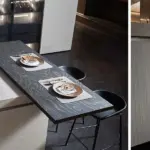 Đảo bếp kết hợp bồn rửa và khu vực chuẩn bị thực phẩm, đồng thời tích hợp bàn ăn phụ thanh mảnh, tạo sự tiện lợi cho cả nấu nướng lẫn sinh hoạt.