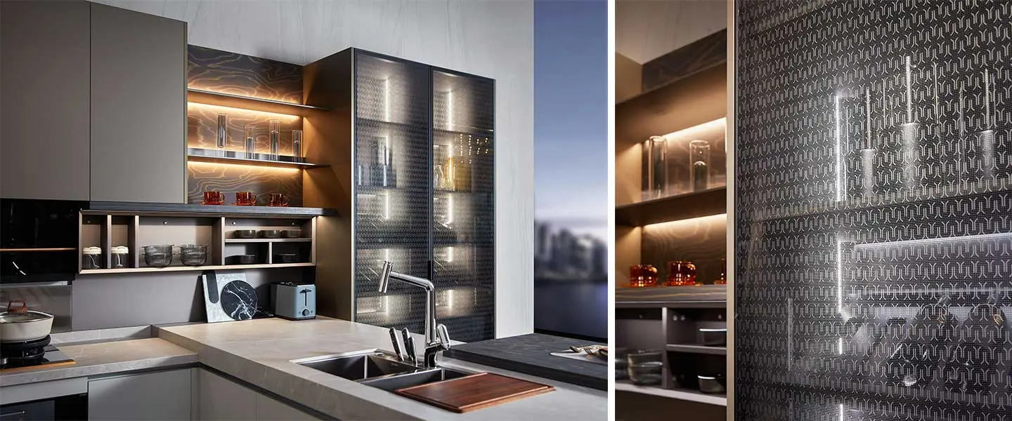 Gam xám Lanshan sang trọng hòa quyện cùng hiệu ứng dập nổi ba chiều và ánh sáng hiện đại tạo nên một không gian bếp vừa ấm cúng, vừa khơi gợi trải nghiệm về phong cách sống tương lai.