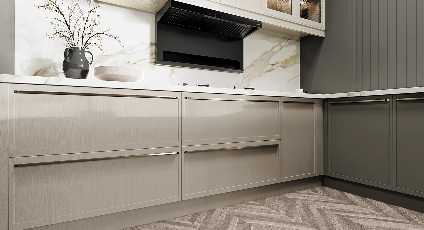 Mẫu tủ bếp cao cấp kiểu Mỹ màu xám hình chữ G thiết kế riêng là sự kết hợp hoàn hảo giữa công năng, thẩm mỹ và trải nghiệm người dùng. Thiết kế tinh giản, hiện đại cùng vật liệu bền đẹp giúp không gian bếp trở thành trung tâm của ngôi nhà, nơi gắn kết và thể hiện phong cách sống của gia chủ. Liên hệ Oppein để được tư vấn và thiết kế riêng mẫu tủ bếp phù hợp nhất với không gian sống!