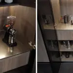 Cửa kính trong suốt, khung nhôm đen sang trọng giúp trưng bày ly tách, chai rượu hoặc đồ decor.