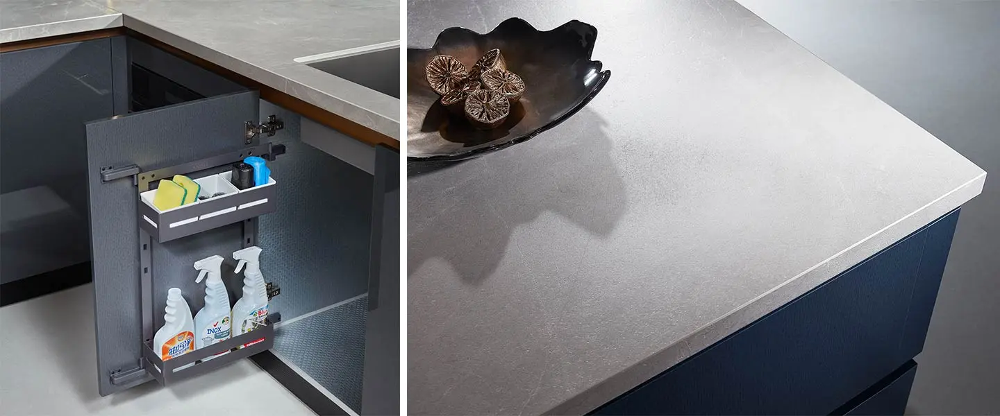 Tủ bếp STARRY nổi bật với họa tiết xoắn ngọc bích trên cửa tủ, đồng điệu cùng đường nét nghệ thuật trong “Starry Night”. Hiệu ứng này mang tới sự liên tưởng đến bầu trời đầy sao, tạo cảm giác không gian bếp luôn sống động và giàu cảm xúc.