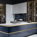 Tủ kính trong suốt kết hợp khung kim loại viền vàng ánh đồng tạo hiệu ứng cao cấp, vừa dùng để lưu trữ vừa trưng bày ly tách, chai rượu hay đồ decor. Ánh sáng LED ẩn bên trong giúp không gian thêm lung linh, đồng thời tăng tính hiện đại.
