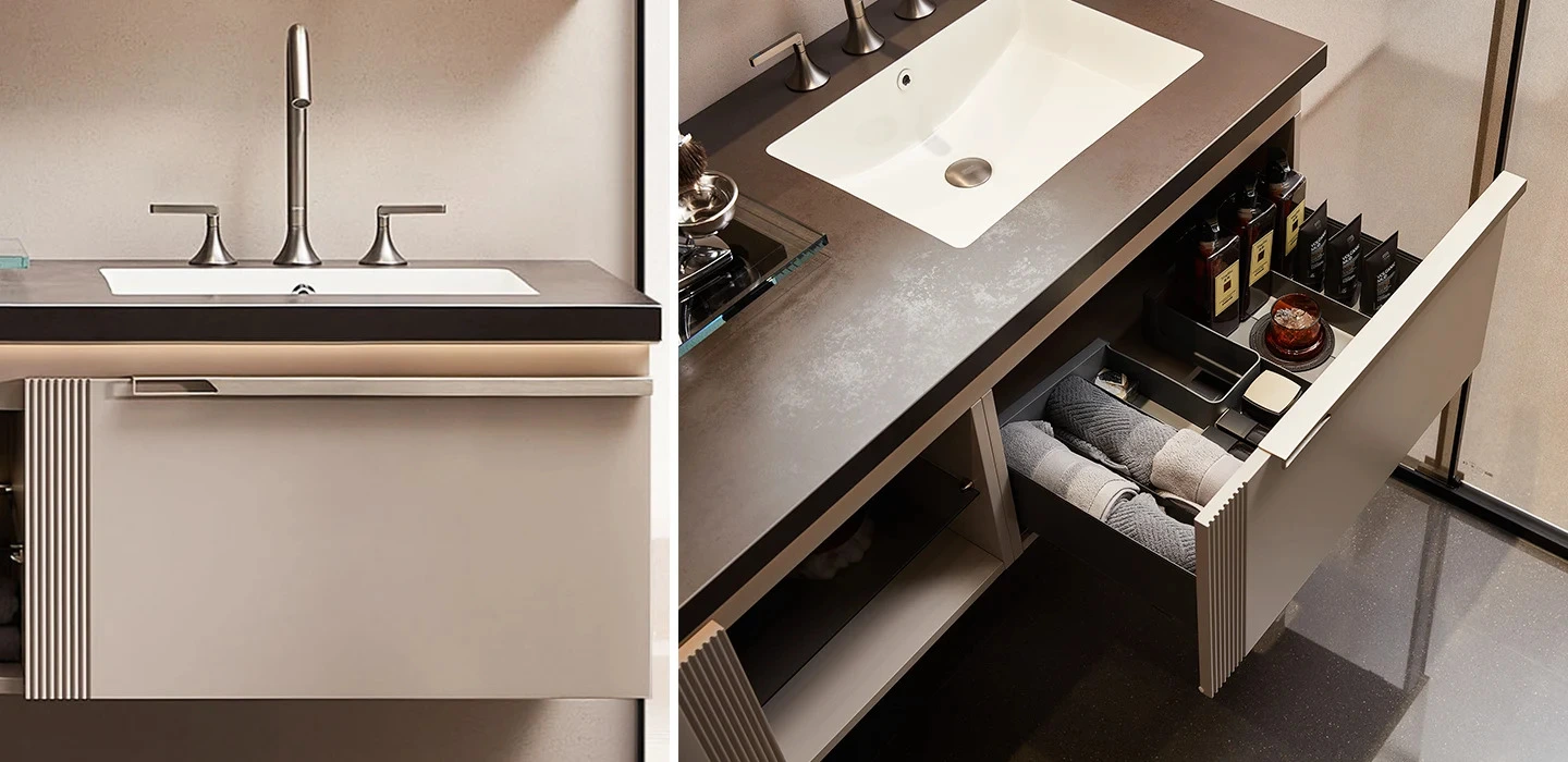 - Hệ tủ treo tường gọn gàng, dễ vệ sinh: Thân tủ được treo tường hoàn toàn, phần sàn phía dưới để trống giúp phòng tắm trông thoáng hơn và dễ quét dọn. Khối tủ dạng hộp dài, bề mặt cánh phẳng phối các đường gân dọc ở vị trí trung tâm tạo nhịp điệu nhẹ nhàng cho mặt đứng. Tông xám nhạt của tủ kết hợp viền trên cùng màu sáng hơn giúp tổng thể mềm mại nhưng vẫn giữ được vẻ tối giản.