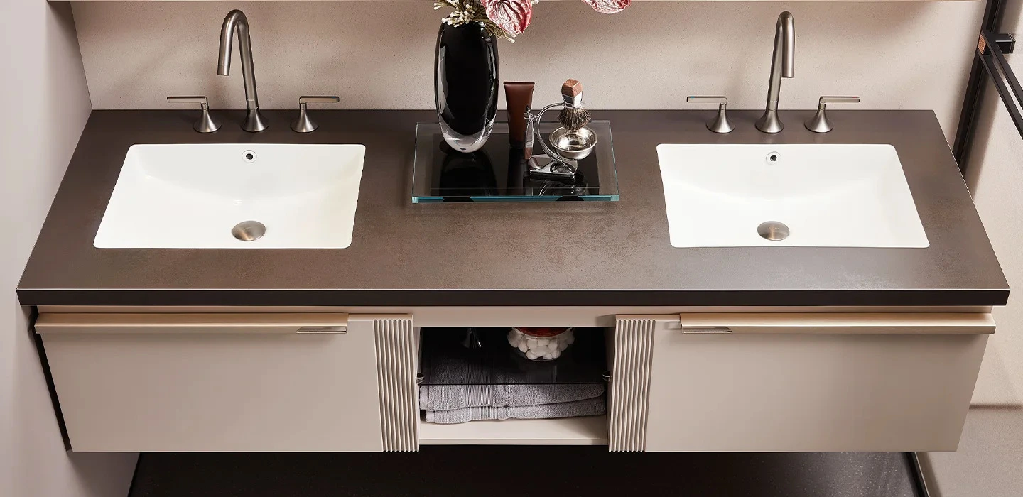 Ý tưởng chính của mẫu tủ Lavabo đôi treo tường hiện đại màu xám nhạt là tạo một khu vực rửa mặt dành cho hai người có thể sử dụng cùng lúc mà vẫn thoải mái. Hai chậu rửa được bố trí đối xứng hai bên, ở giữa là khoảng trống để trưng bày lọ hoa, khay mỹ phẩm, tạo điểm nhấn trang trí. Mặt bàn màu nâu xám trầm kết hợp thân tủ xám nhạt mang đến cảm giác ấm áp nhưng vẫn hiện đại, phù hợp nhiều phong cách nội thất khác nhau.