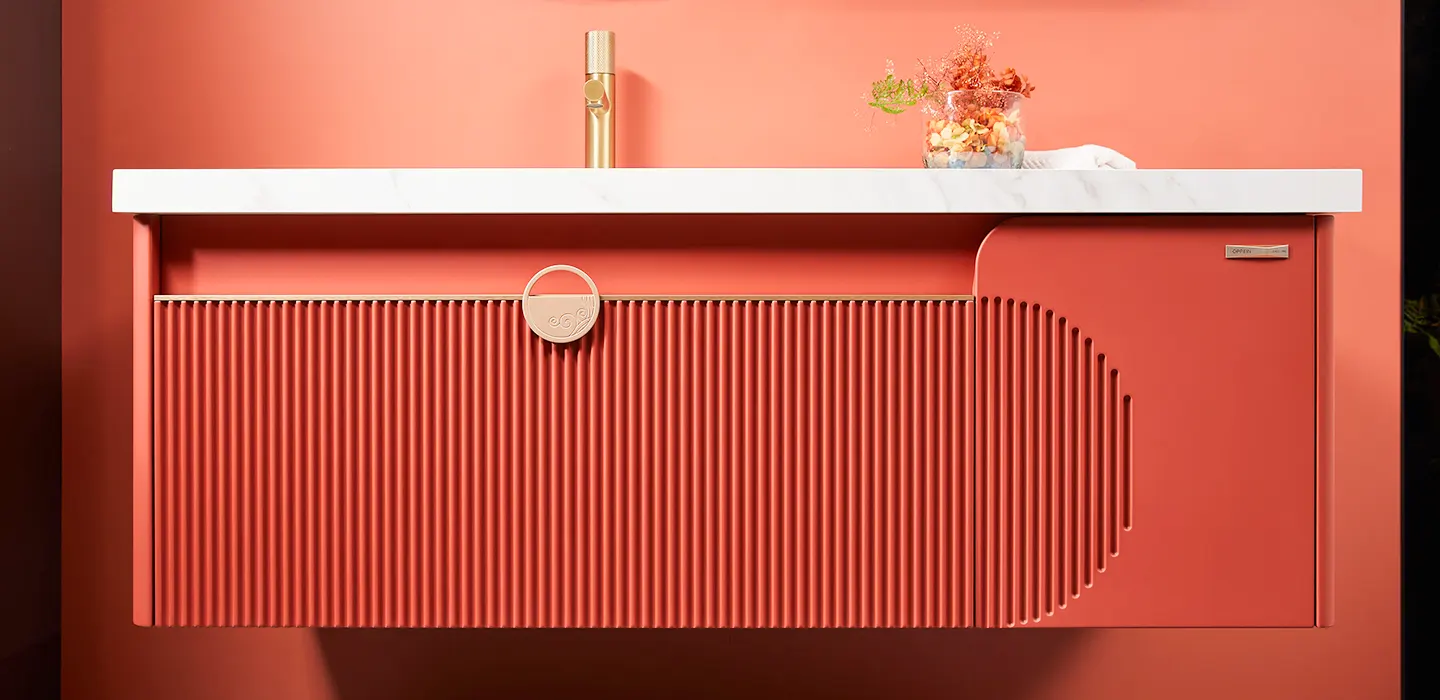 Ý tưởng chính của thiết kế này là tạo nên một hệ Lavabo mang tính nghệ thuật nhưng vẫn tiện dụng trong sử dụng hằng ngày. Sự hòa hợp giữa mặt đá thạch anh trắng, thân tủ sơn mài đỏ và chi tiết kim loại mạ vàng mang đến tổng thể mềm mại nhưng có điểm nhấn rõ ràng. Các đường rãnh dọc ở cánh tủ tạo hiệu ứng thị giác giúp chiếc tủ thêm chiều sâu, đồng thời nhấn mạnh phong cách hiện đại và chỉn chu của không gian.
