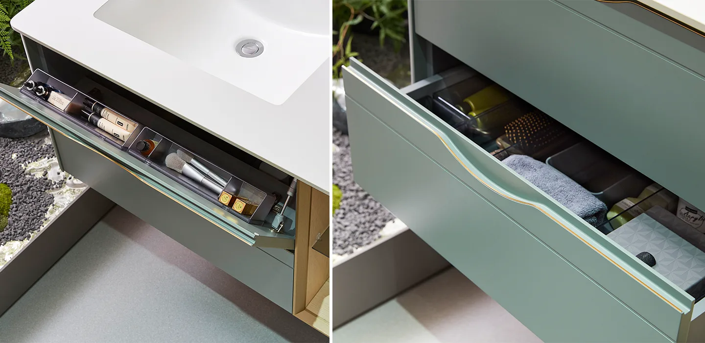Tủ lavabo được trang bị đa dạng các giải pháp lưu trữ với hệ tủ treo tường và tủ dưới, bao gồm cả không gian mở và khoang kín. Thiết kế ngăn kéo tinh xảo tận dụng tối đa diện tích, trong khi các kệ kính ở phần tủ mở giúp sắp xếp đồ đạc gọn gàng, dễ dàng tìm kiếm và sử dụng.