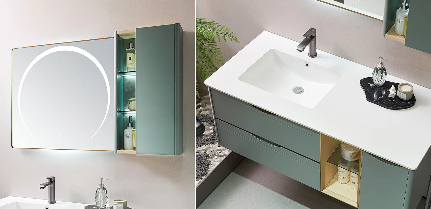 Mang sắc xanh dịu nhẹ đầy tinh tế, tủ lavabo được thiết kế nhằm tạo nên cảm giác thư giãn, thanh bình nhưng vẫn giữ được nét sang trọng cho không gian.