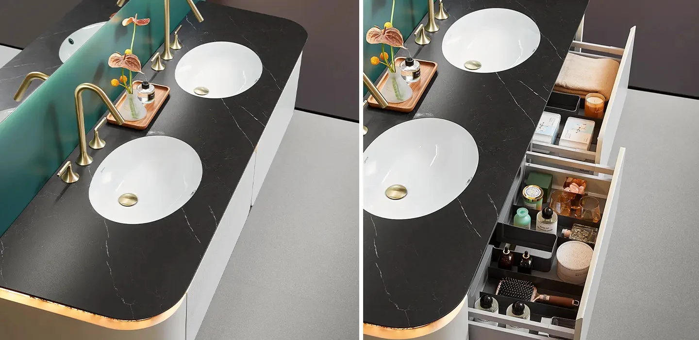 Thiết kế tủ lavabo: BST Flowering mang đến dáng vẻ trẻ trung, hiện đại với thiết kế tối giản, đường nét rõ ràng. Bộ tủ không chỉ tạo điểm nhấn thẩm mỹ mà còn giúp không gian phòng tắm trở nên thư thái, tách biệt khỏi nhịp sống đô thị, hướng đến sự gần gũi và hài hoài với thiên nhiên.