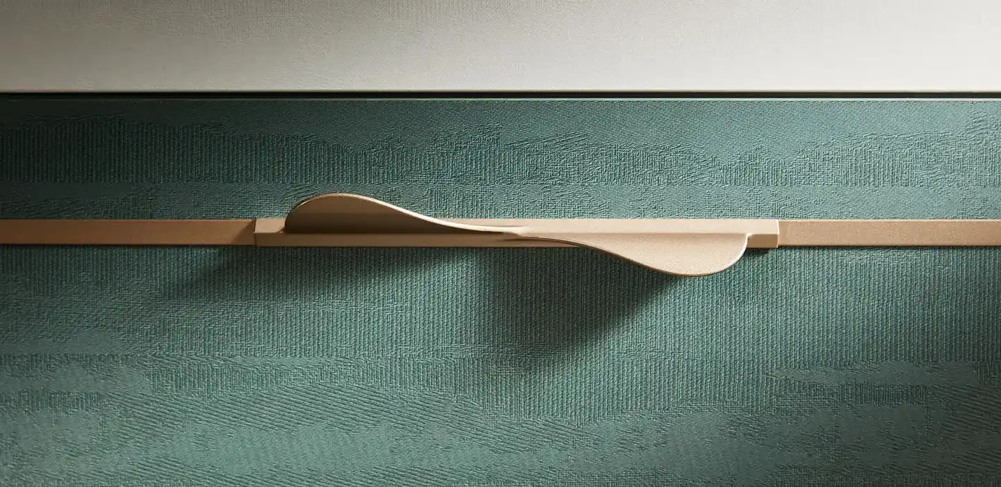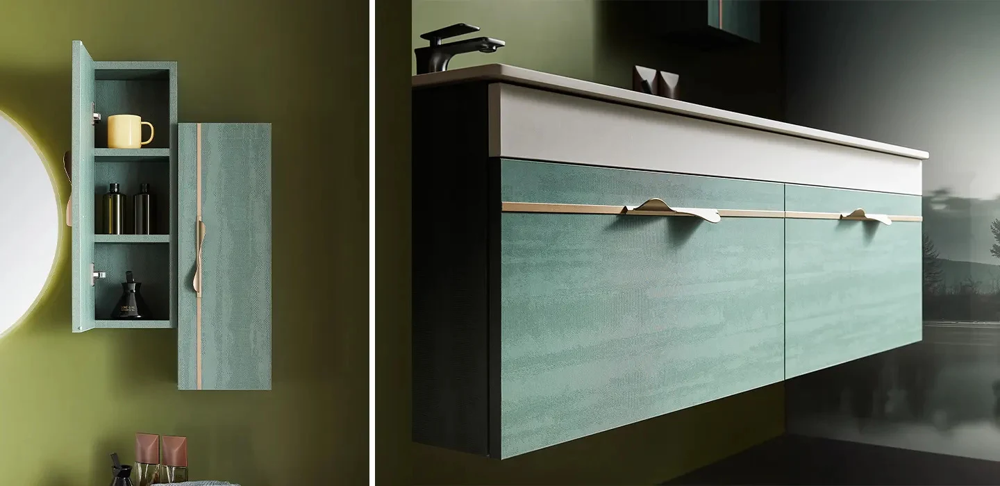 - Màu xanh trầm kết hợp đường viền kim loại ấm: Bề mặt cánh tủ mang tông xanh trầm, vân nhẹ tạo cảm giác gần gũi, không bị lạnh. Đường viền kim loại mảnh chạy ngang thân tủ và dọc tủ phụ, kết hợp tay nắm uốn cong mềm mại giúp tổng thể trở nên sinh động hơn. Sự phối hợp này tạo nên vẻ sang trọng mà vẫn ấm áp cho phòng tắm nhỏ.