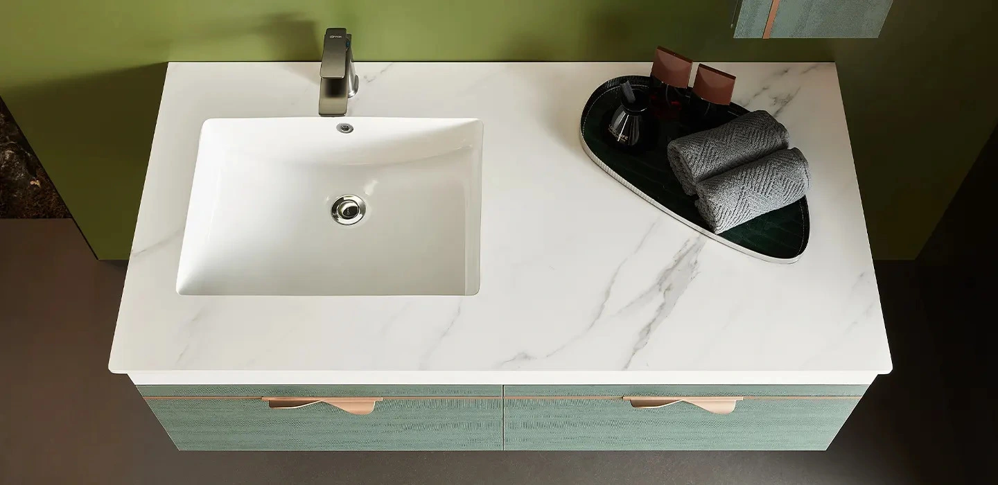 Mặt đá trắng vân mây trải dài theo chiều ngang tạo cảm giác bề mặt rộng rãi, cân bằng với phần cánh tủ màu xanh phía dưới. Hệ tủ phụ cao treo sát gương tận dụng chiều cao bức tường, bổ sung thêm không gian cho khăn tắm, mỹ phẩm và vật dụng cá nhân mà không chiếm thêm diện tích sàn.