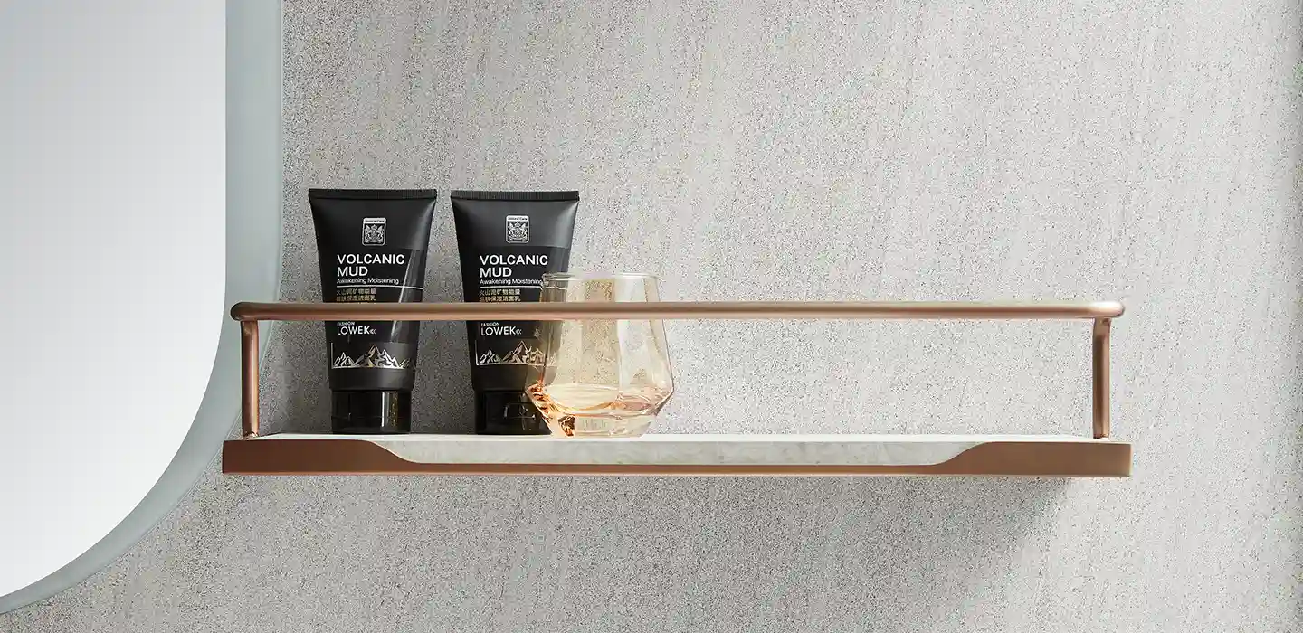 Space-Saving Design: This wall-mounted vanity has a minimalist, straight-line design that’s both compact and practical. It includes coffee copper floating shelves that provide extra storage without taking up floor space.