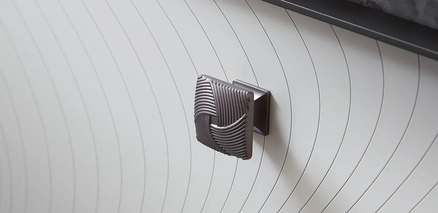 The delicate woven gray metal pull serves a functional purpose and acts as a stylish embellishment.