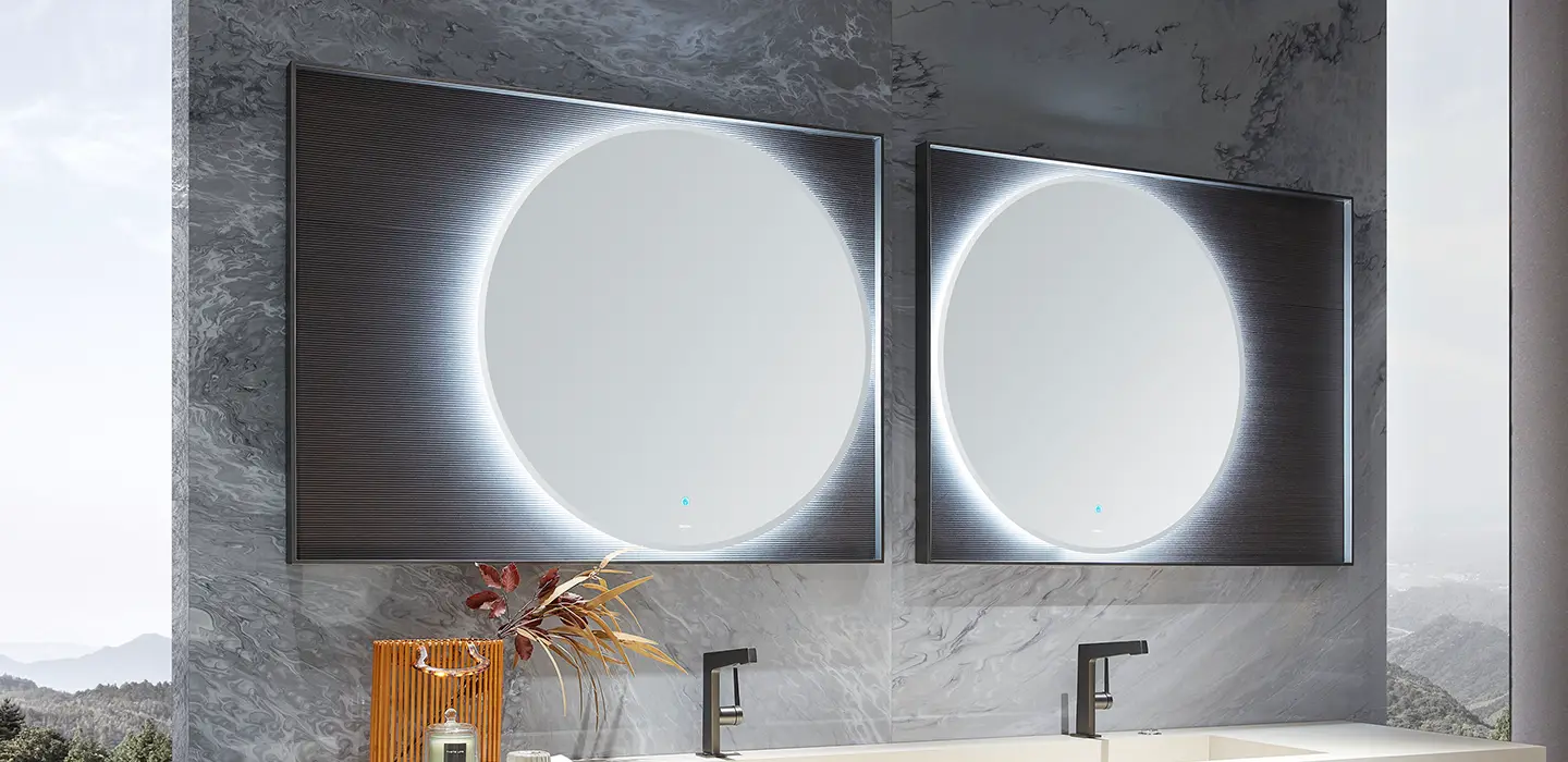 striking the perfect balance between practicality and high-end luxury. The wood veneer back panel behind the mirrors is accented with metal edging,