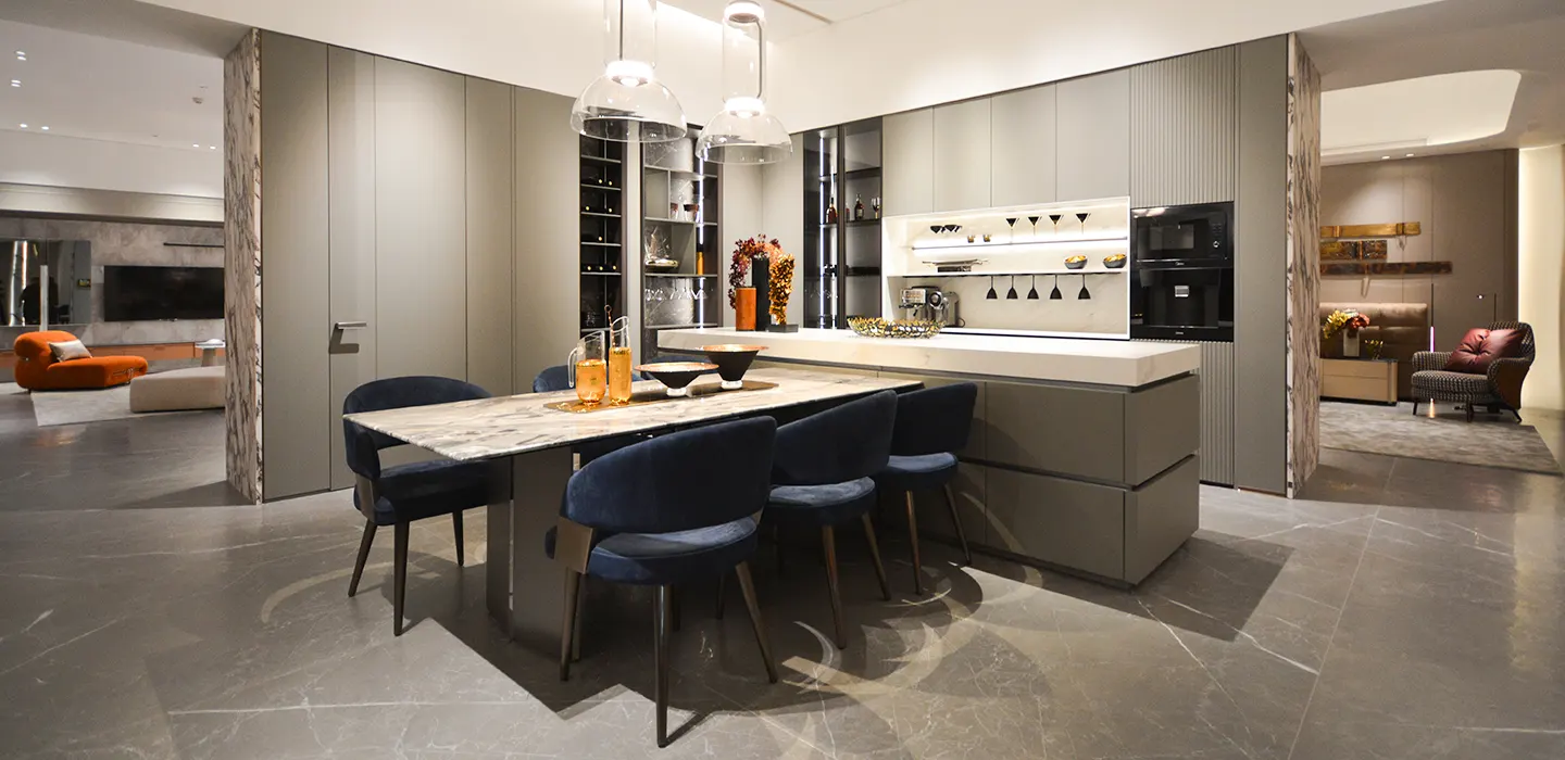 Lấy cảm hứng từ sự biến hóa của các khối hình học, thiết kế của tủ Moonlight Shadow chú trọng vào những đường nét vuông vức, được xử lý vát cạnh 45 độ tinh tế. Màu xám trung tính chủ đạo tượng trưng cho sự thanh lịch, kết hợp hài hòa với các mảng ốp đá vân tự nhiên, gỗ veneer trầm và ánh sáng hắt nhẹ từ hệ đèn LED âm tủ, tạo nên hiệu ứng thị giác mềm mại và sang trọng.