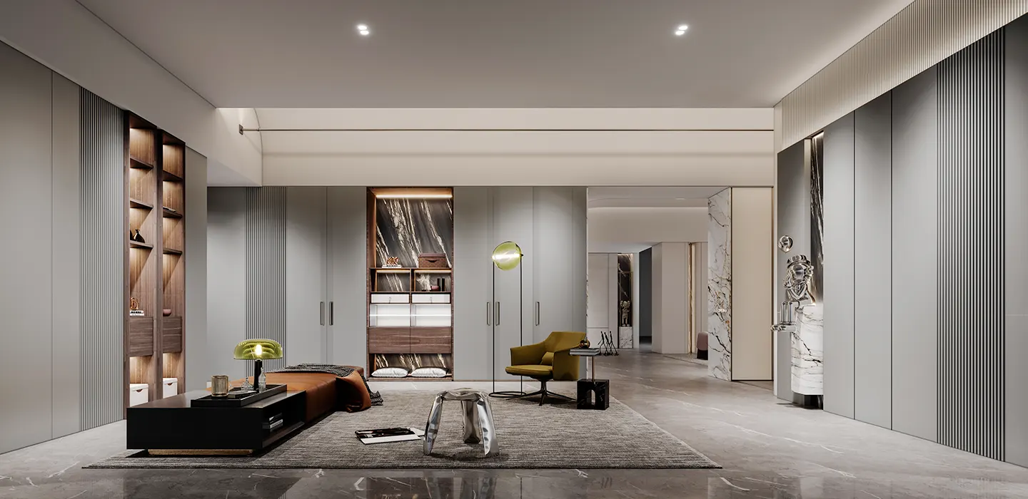 Mỗi chi tiết của tủ quần áo cao cấp hiện đại màu xám Moonlight Shadow đều phản ánh tinh thần của thiết kế Ý đương đại: tối giản nhưng trau chuốt, mạnh mẽ nhưng vẫn mềm mại. Sự kết hợp hài hòa giữa gỗ, đá và kim loại tạo nên chiều sâu vật liệu và mang lại cảm giác sang trọng cho không gian. Không chỉ là nơi lưu trữ, tủ Moonlight Shadow còn là một tác phẩm nội thất thể hiện gu thẩm mỹ và đẳng cấp của gia chủ, nơi nghệ thuật và công năng hòa quyện hoàn hảo.