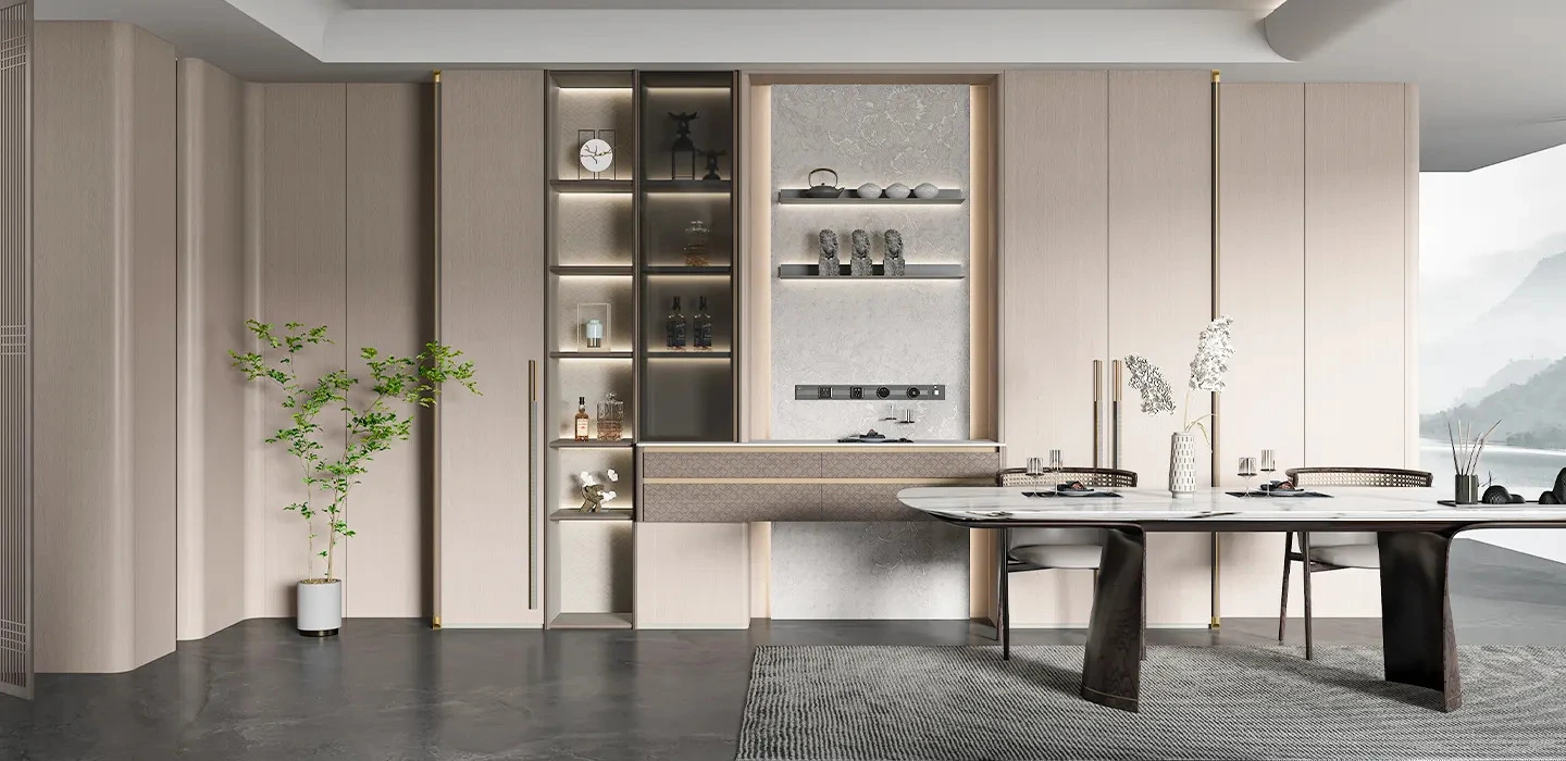 Điểm đặc biệt không thể bỏ qua là hệ đèn LED âm được tích hợp tại các kệ mở. Ánh sáng dịu nhẹ giúp tôn lên vẻ đẹp tinh tế của vật dụng trưng bày, đồng thời mang lại cảm giác ấm áp, sang trọng cho toàn bộ không gian. Thiết kế này không chỉ tạo hiệu ứng thẩm mỹ mà còn hỗ trợ người dùng dễ dàng tìm kiếm đồ đạc trong mọi thời điểm.