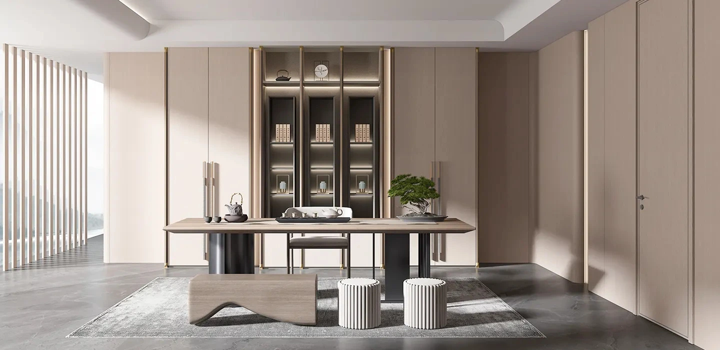 Sự kết hợp giữa tủ kín (lưu trữ chính) và kệ mở (trưng bày decor) giúp tổng thể gọn gàng, sinh động