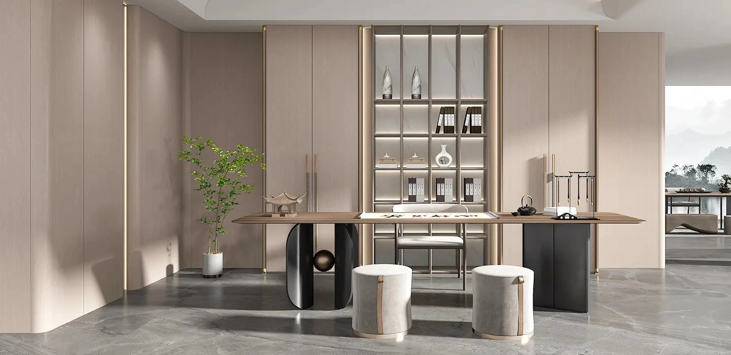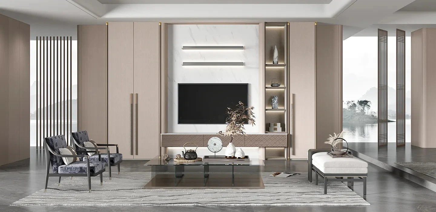 Bố trí đối xứng quanh kệ trung tâm, tạo cảm giác cân bằng và sang trọng.
